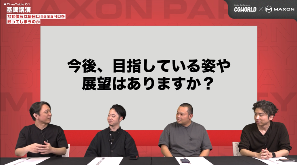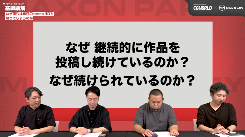 2025年5月28日(水)に開催されたMaxon製品を活用するクリエイターたちによるセッションイベント「MAXON PARTY '25春」。ここでは、大盛況で閉幕した本イベントから「基調講演:なぜ僕らは毎日Cinema 4Dを触ってしまうのか」の様子をレポートする。登壇者は、聞き手の株式会社カーキから横原大和氏と、寺島圭佑氏、株式会社REDのまめたろう氏、株式会社MULTRAの森田仁志氏の4名。Cinama4Dを毎日使用しているクリエイターだからこそ語れる、“続けられる理由”と“自分のスタイル”について伺った本セッションのレポートを抜粋してお届けする。