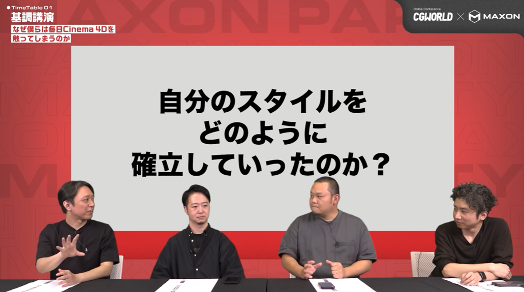 横原:では、ここからのトークテーマは「Cinema 4Dに触れ続ける中で感じた自分のスタイル」です。皆さんの最初の出会いから今のスタイルに至るまで、どんな変遷があったのかを聞いていきたいです。