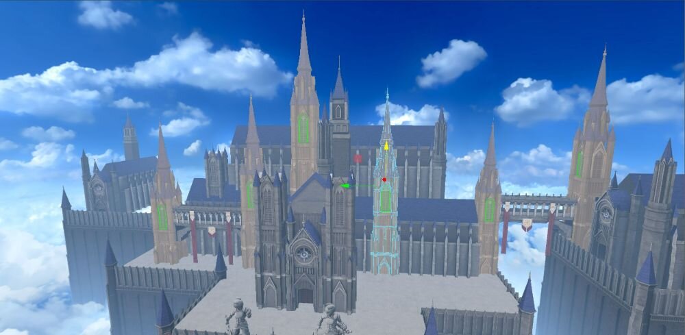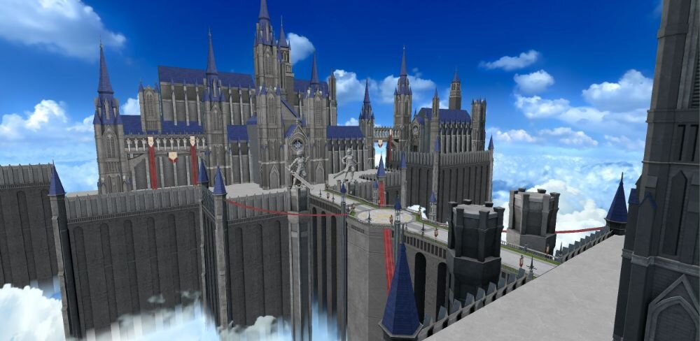 ガーネットがアクションを繰り広げる舞台として用意されたのは、天空にある広大な城だ。広場のまわりに荘厳な石像や塔が並び立つ。できるだけ見た目に気を遣いながらも、多くの人に使ってもらいたいフリーリグという性質のため、Maya上で軽量になるよう仕上げられている。