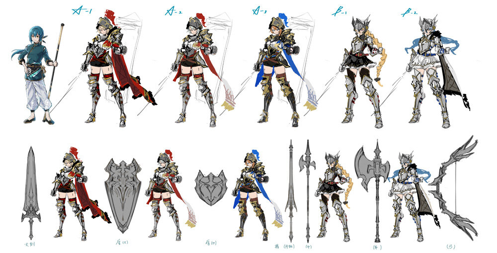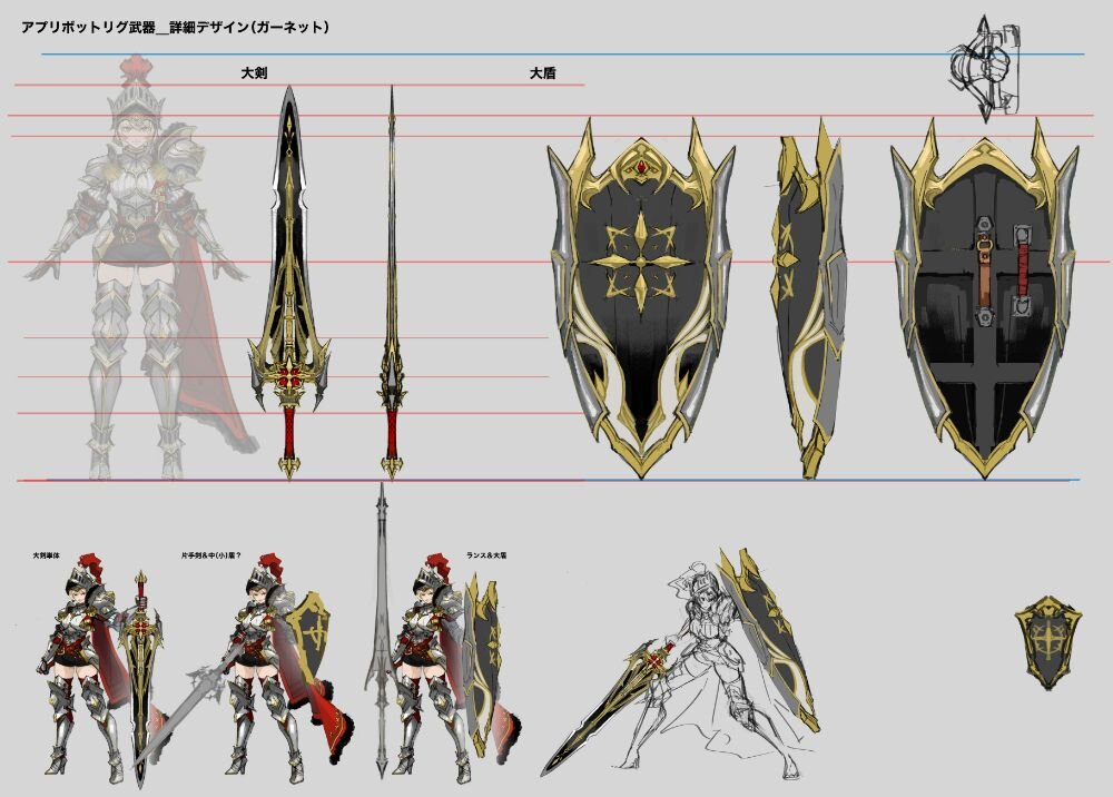 ガーネットは「甲冑」と「重さ」という2つのキーワードを大切にデザインを進められた。ラフにはアプリボットのコーポレートカラーである青を基調にした案や、大型の斧や弓を持ったものもある。「大きな武器を持つ女の子キャラクターは魅力的ですし、重たいモーションが映えそうだなと意識しながらデザインしていきました」(山口氏)。