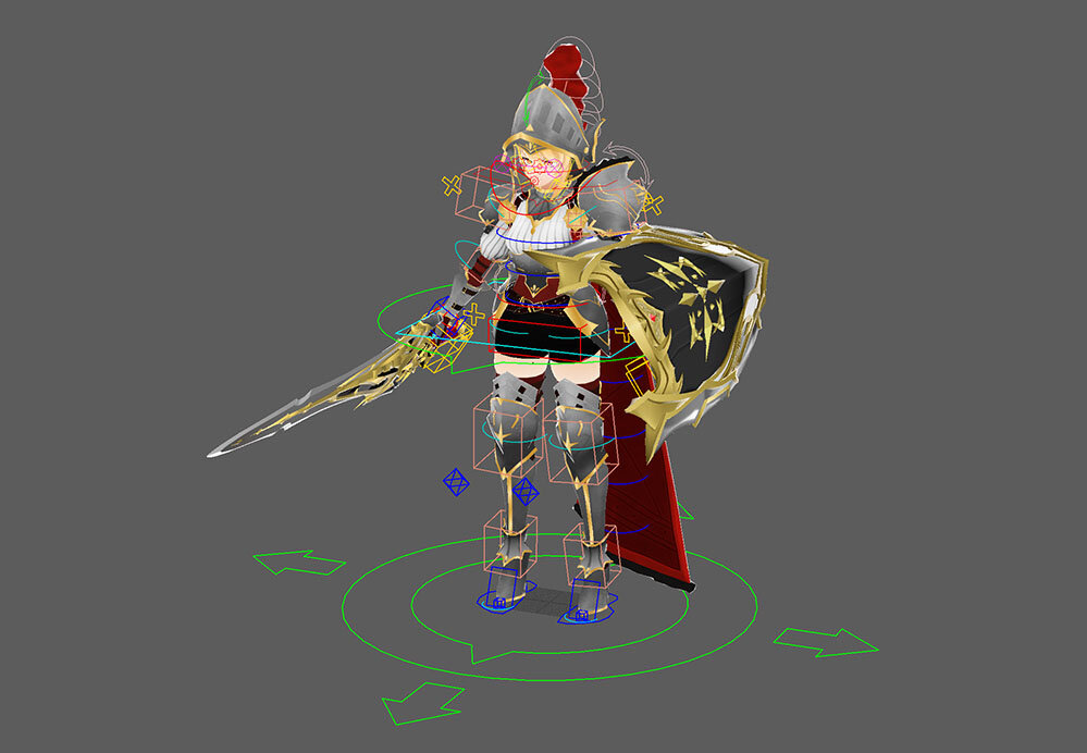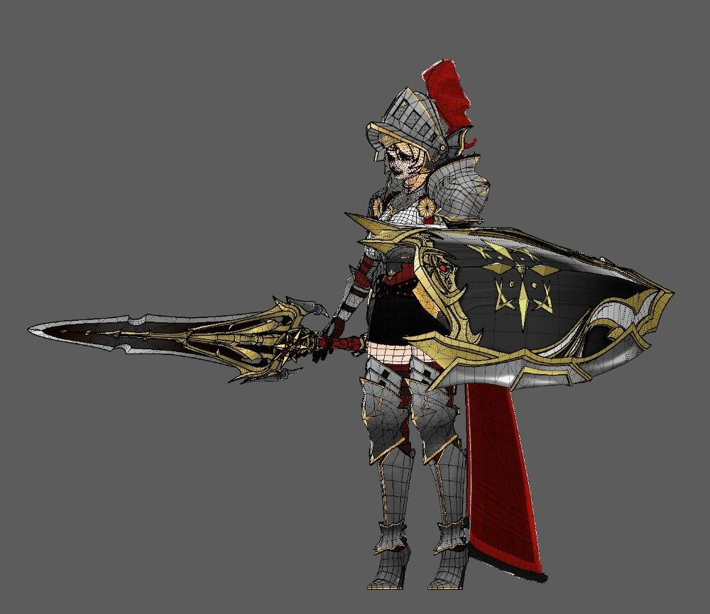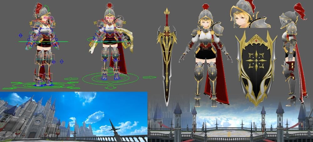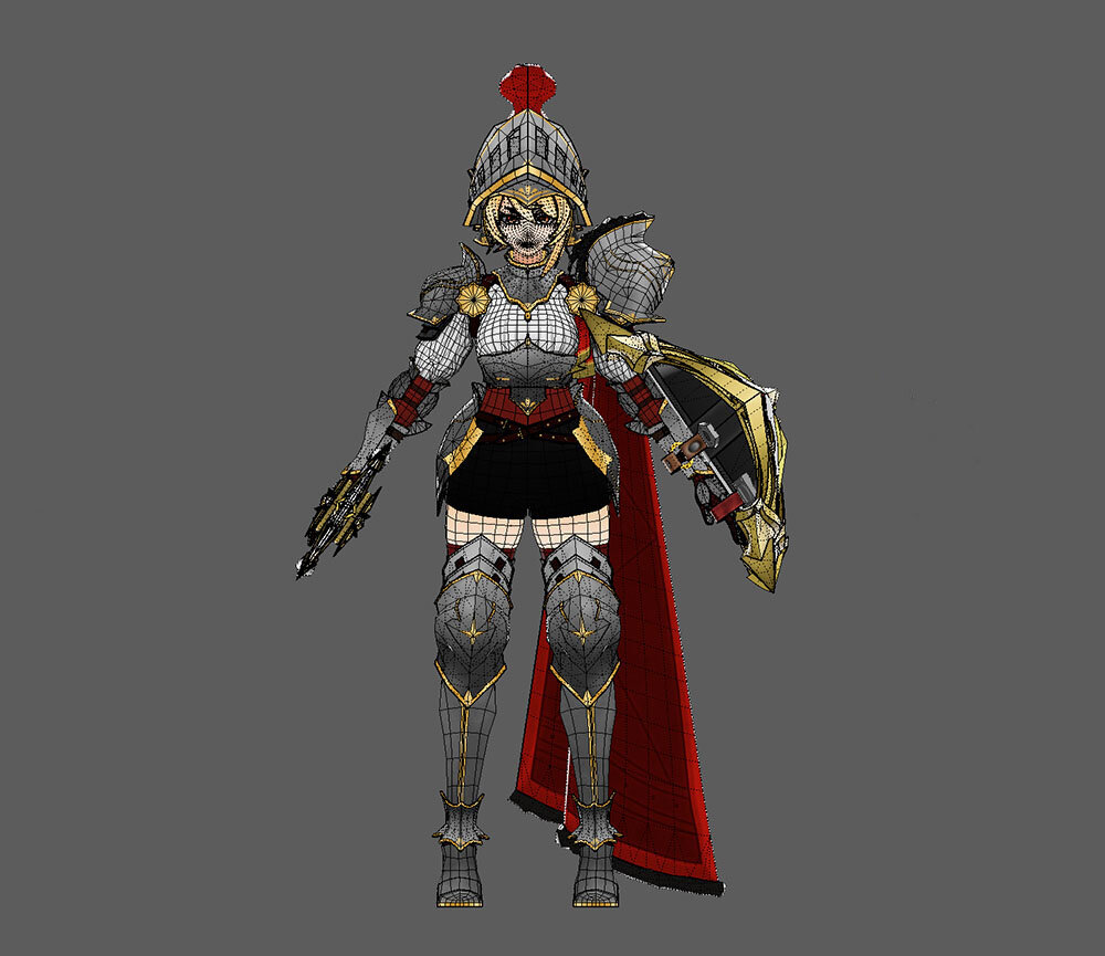 モデル制作はキャラクター班が担当。ガーネット本体を3Dモデラーの松田 空氏、剣と盾を別の2名が担当し、計3名で制作した。「いかにアートの印象を崩さず、かわいい女性騎士のビジュアルを3DCGに落とし込むかという点が課題でした」(松田氏)。