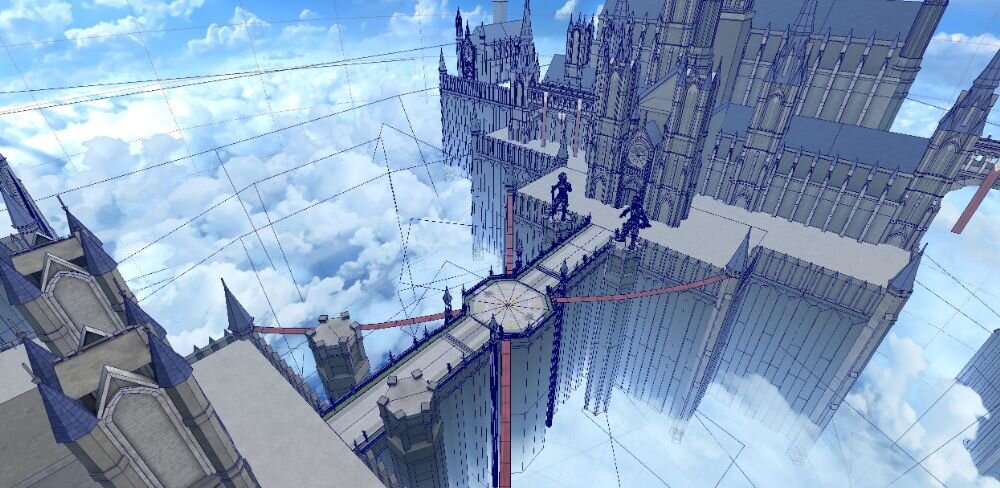 アプリボットリグはMayaビューポートでの描画を前提としているため、ゲームエンジン上の見た目と比べて表現には大きく制限がかかる。それでも、できるだけリッチな印象を目指す工夫として、天空の城の壮大さが伝わるよう、ビューポート描画でありながらフォグが追加されている。距離と高さに応じて背景全体に霧がかかるようになっており、距離が離れるほどオブジェクトに白く霧がかかるよう、マテリアルが調整されている。