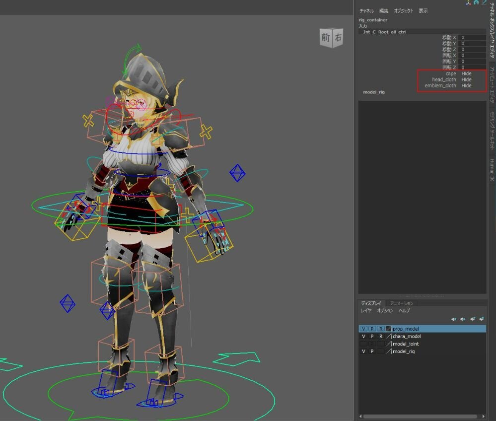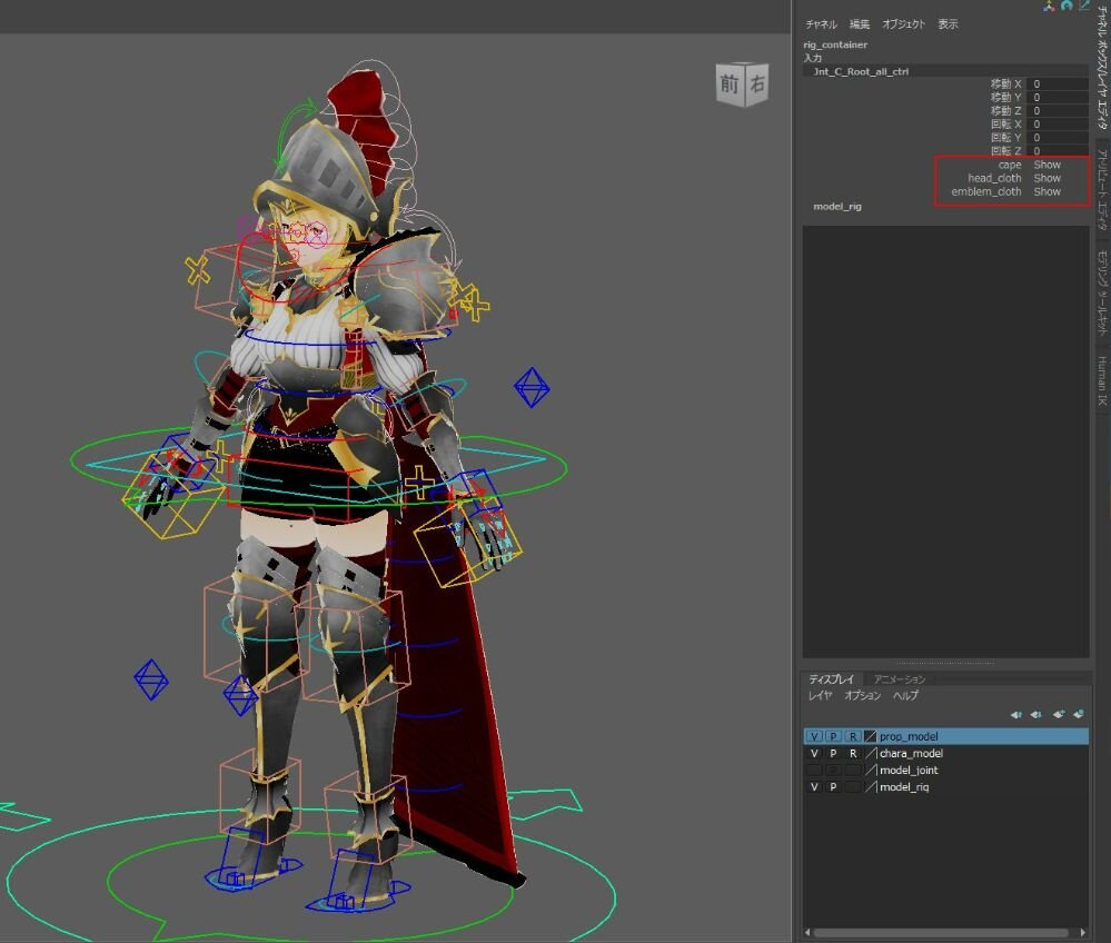 ルートコントローラにはパーツごとの切り替えアトリビュートが追加されており、[cape]、[head_cloth]、[emblem_cloth]でそれぞれのパーツの表示/非表示を切り替えることができる。