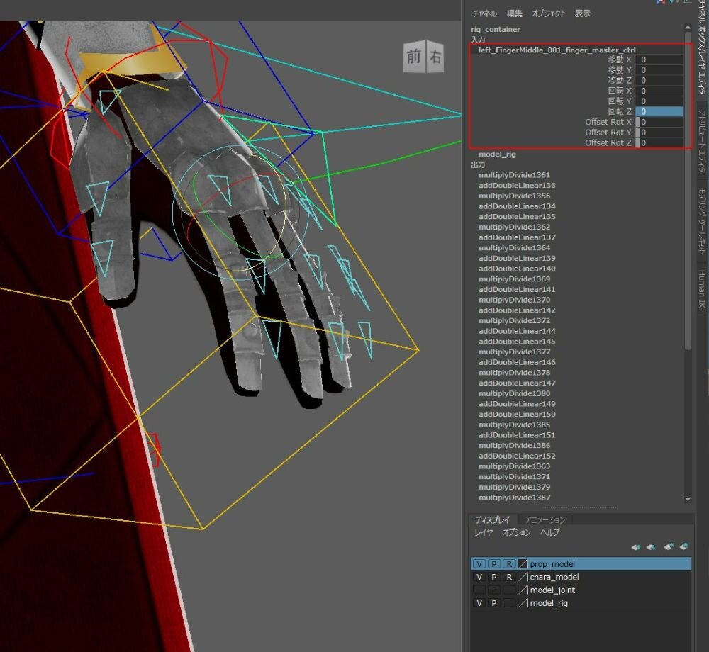 この入出力により、モデルやジョイントの更新にも柔軟に対応できる。「ジョイントを登録するだけで複雑なSpline IKやReverse Footをボタンひとつで組み上げられるなど、とても使いやすいです。ガーネットではGeneral Rigで構築した上で、誰でも利用できるよう、内製ノードを一般的なノードに置き換えて配布しています」(3Dモーション&リガー・平田清孝氏)。