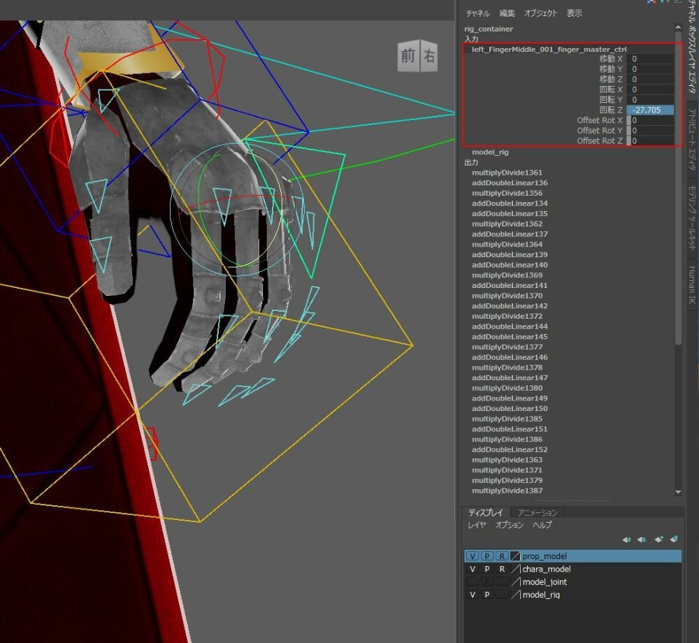 煩雑になりがちな多くの機能がひとつのUIに整理されていることに加え、計算系ノードを内製プラグインで充実させるなど、リギングのコストを抑える工夫がなされている。コントローラを部分的に設置し確認、こまめに調整しつつ全体を組み上げていくことも可能で、さらにその情報をテキストで書き出し・読み込みする機能も備わっているので、作業者同士での共有も容易だ。