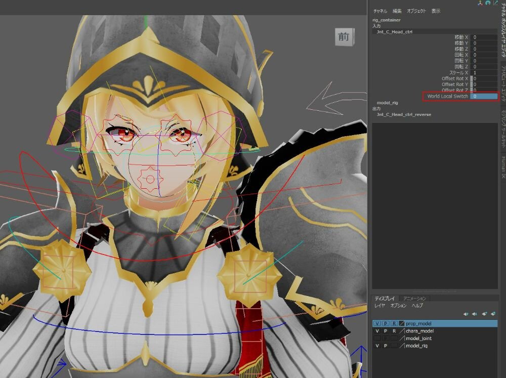 ▲頭部のコントローラには、頭部の回転をWorldかLocalかをスイッチするためのアトリビュートが用意されている。通常は0で、頭部はローカル回転となる -