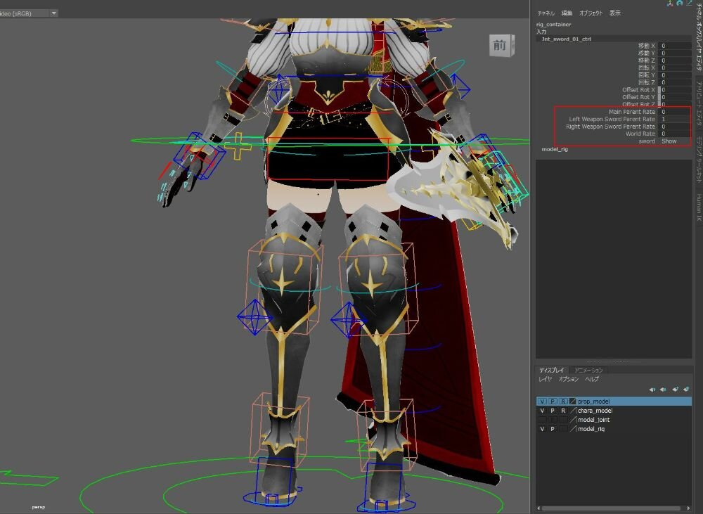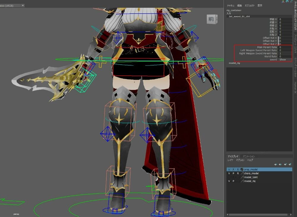 剣のコントローラには[Parent Rate]というアトリビュートが複数用意されており、それぞれの値を1にすることで、各部位に指定した位置へ剣を移動させることができる。