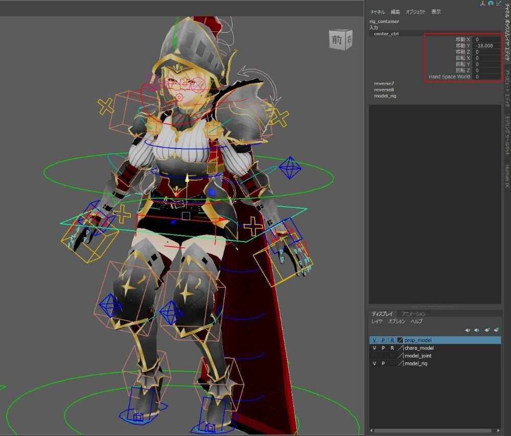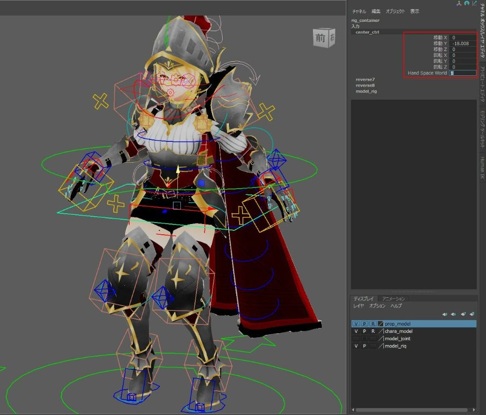 腰に設置された[center_ctrl]には、[Hand Space World]アトリビュートが追加されている。[center_ctrl]で腰の位置を下ろした際、手の位置をワールドにするか腰のローカルにするかを選択できる。