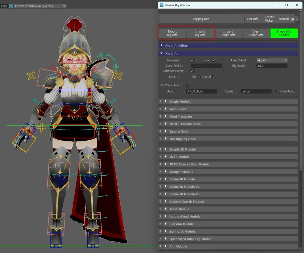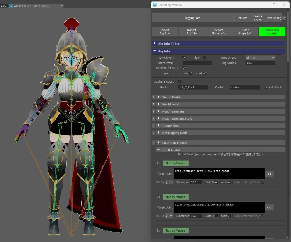 ▲[General Rig Window]上部には[Export Rig Info]、[Import Rig Info]ボタンが用意されており、ジョイントやコントローラ形状など、設定した全ての情報をテキストとして入出力可能となっている