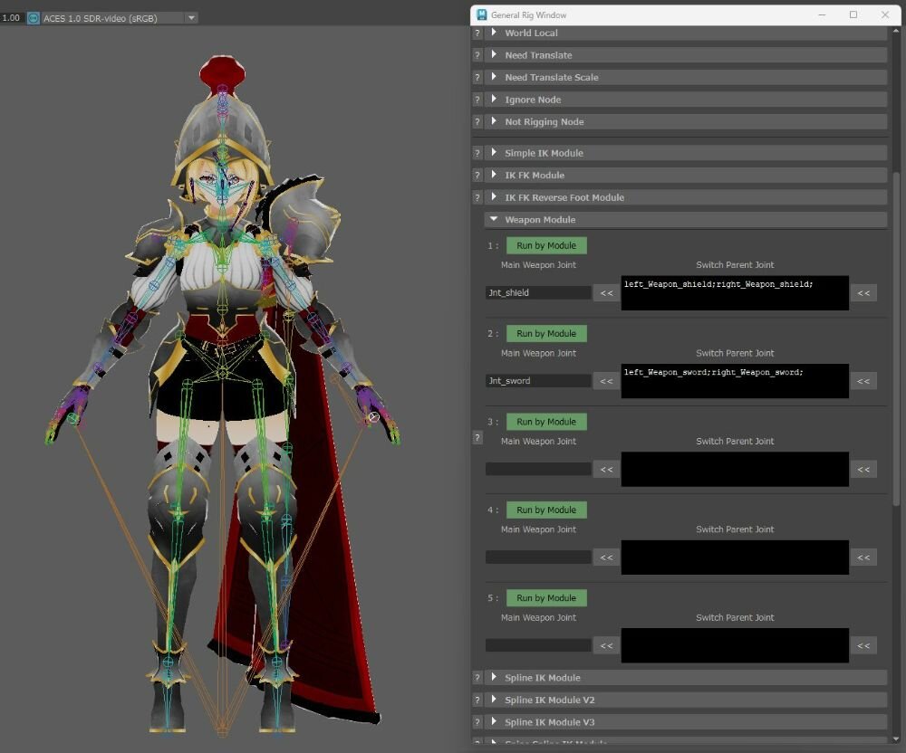 リギングシステム「General Rig」の設定ウィンドウ。[Single Module]、[Simple IK Module]、[Spline IK Module]など様々なモジュールで構成されている。
