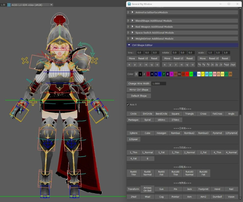 ▲コントローラの見た目を編集できる[Ctrl Shape Editor]も組み込まれていて、色・形・大きさ・角度・位置を設定できる。形状は「平面系」、「立体系」、「方向系」、「回転系」、「特殊系」と種類分けされ、動かす箇所に適した形状を選ぶことができる