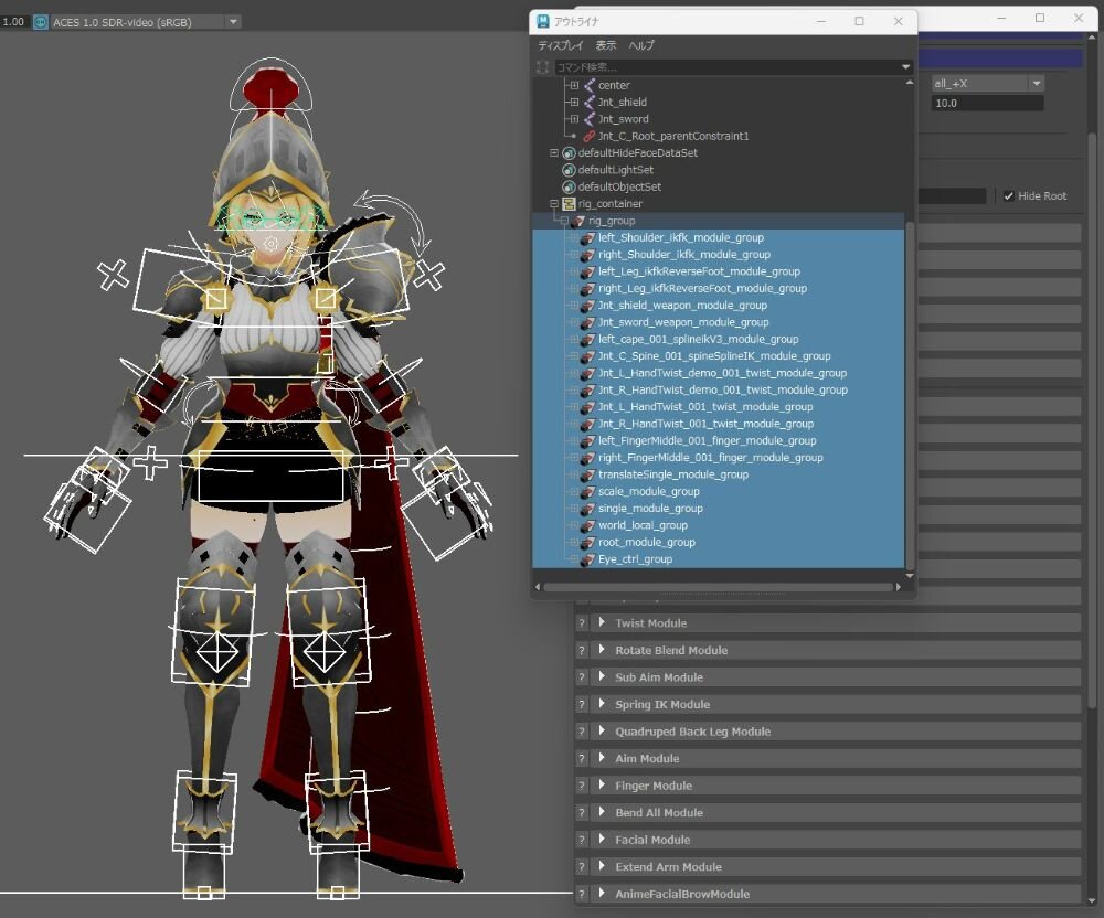▲生成したリグはコンテナ化可能で、設定時のモジュールごとにグループ分けされてコンテナ内に格納される。この際、コントローラを選ぶ上で不要なノード(コンストレインなど)は非表示になる -
