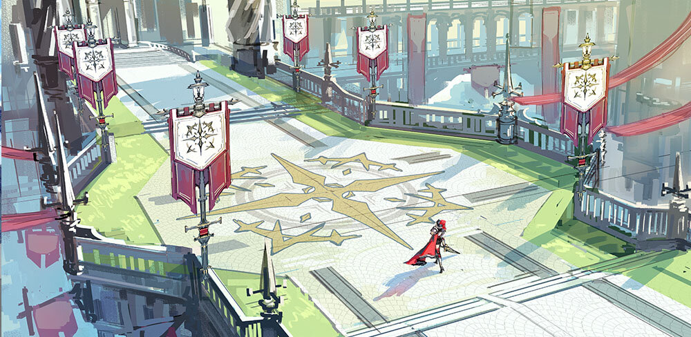 ▲背景のラフ。ファンタジックで広大な浮遊城というコンセプトを基に、杉本氏がリファレンスを収集・キットバッシュを起こし、それを基に山口氏が紋章などの詳細デザインを起こした -