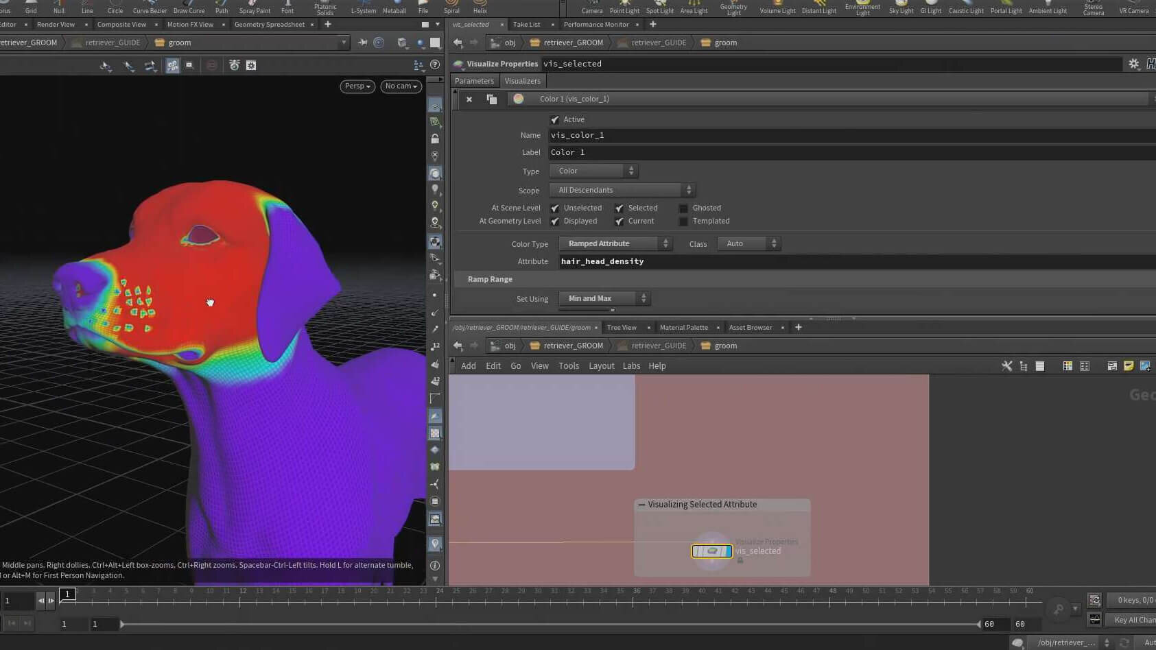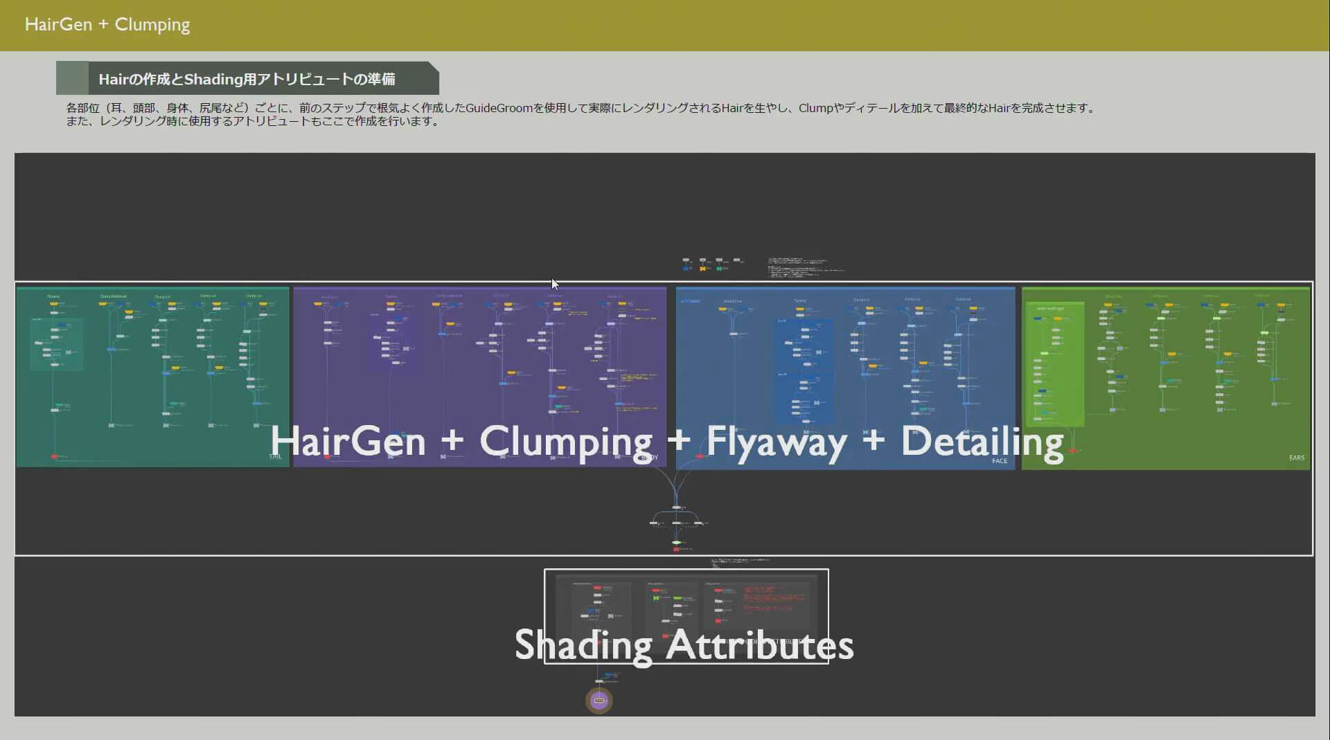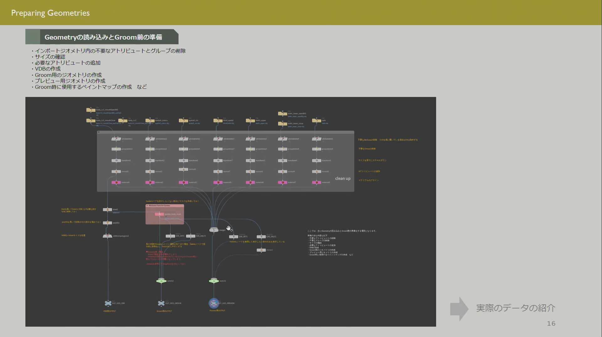 続いてグルーミング用のジオメトリを準備する。インポートしたジオメトリのクリーンアップやサイズ調整、アトリビュートの追加、プレビュー用ジオメトリの作成、グルームで使用するペイントマップ作成などがその内容だ。