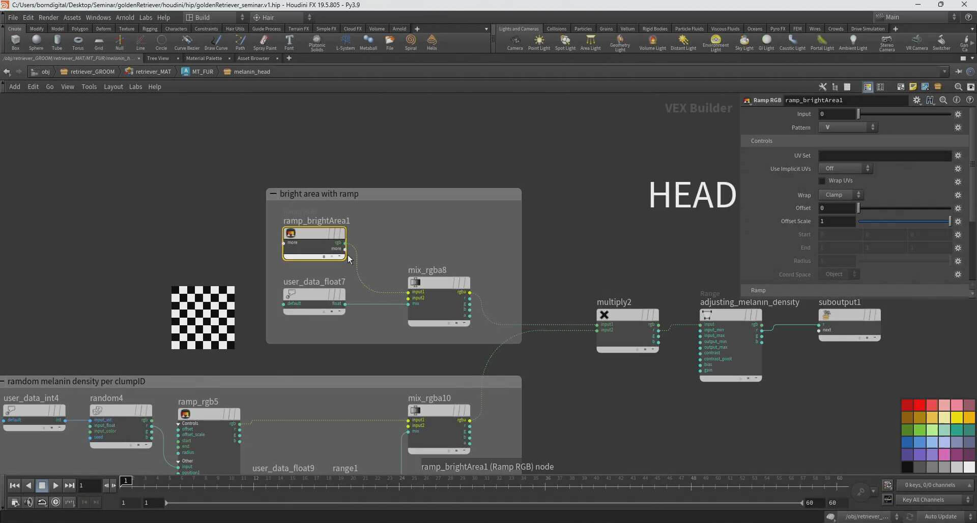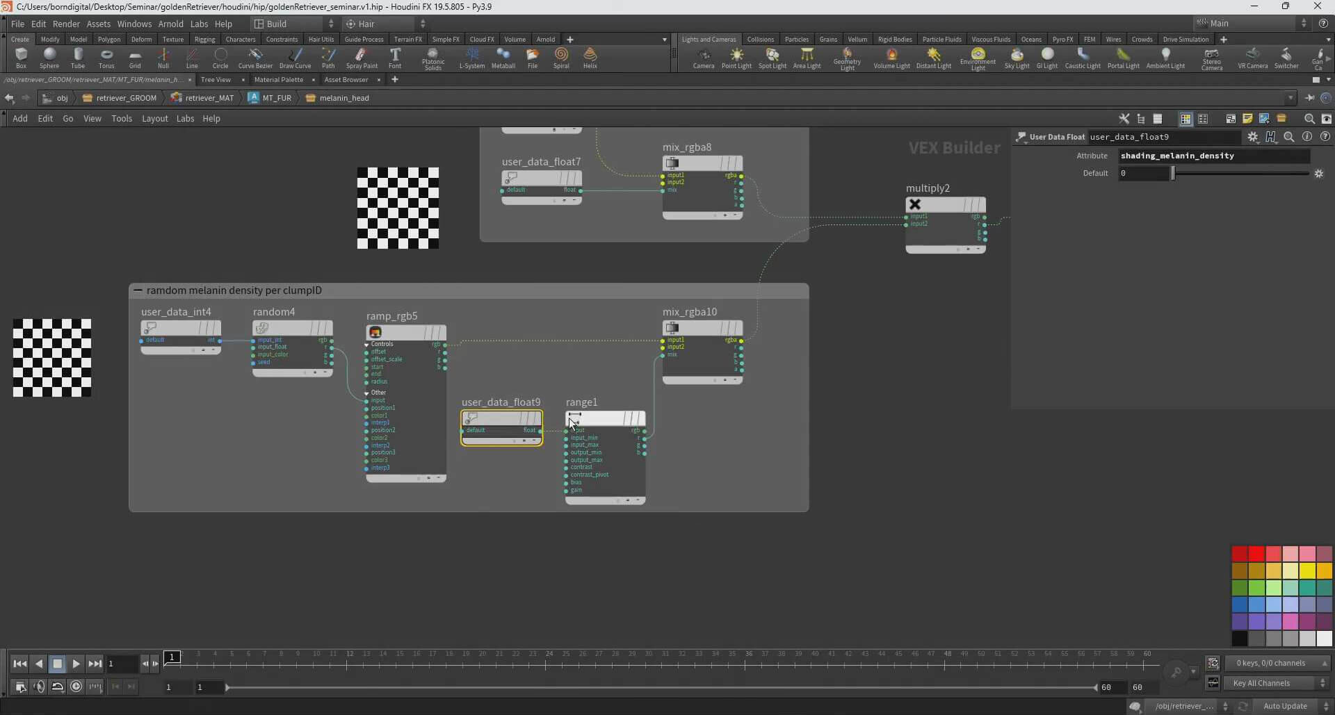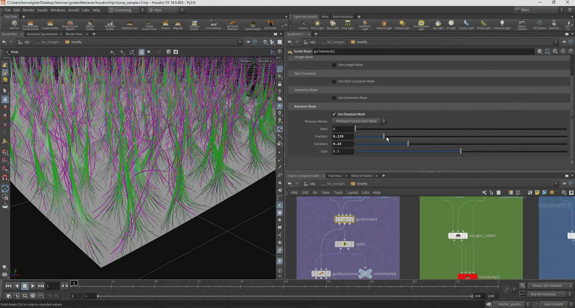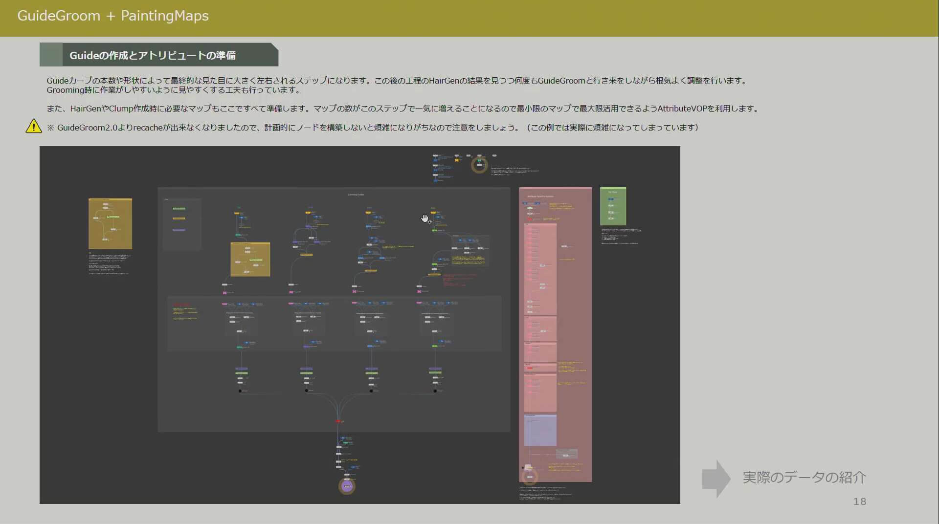 続いてグルーミング用のジオメトリを準備する。インポートしたジオメトリのクリーンアップやサイズ調整、アトリビュートの追加、プレビュー用ジオメトリの作成、グルームで使用するペイントマップ作成などがその内容だ。