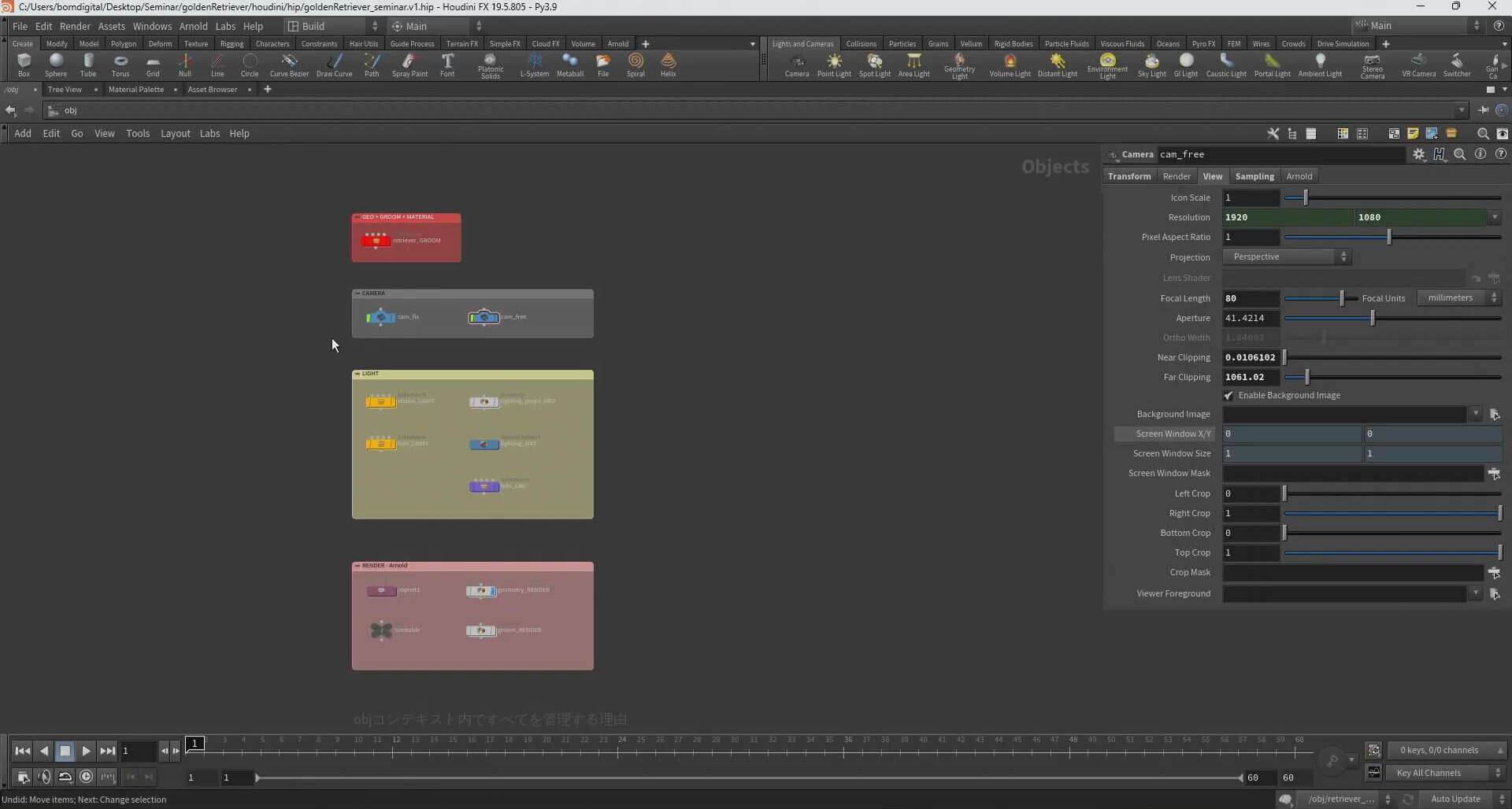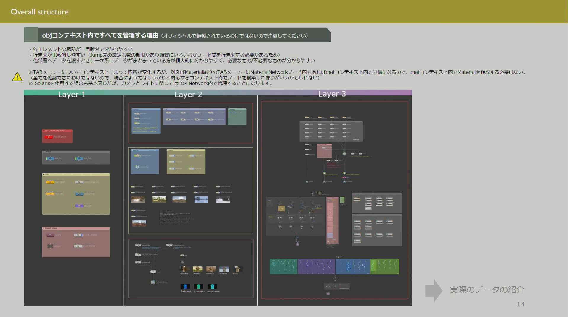 Houdiniでのアセット制作において、西田氏は複数のコンテキスト間を行き来する煩雑さを避けるため、プロジェクトのほとんどの工程をobjコンテキスト内で完結させる手法を採用した。