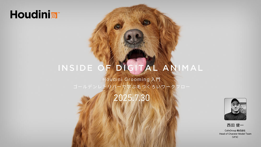 2025年7月30日(水)に東京・ワテラスコモンホールで開催されたHoudiniセミナー「INSIDE OF DIGITAL ANIMAL~Houdini Grooming入門 ゴールデンレトリバーで学ぶ毛づくろいワークフロー~」のレポートをお届けする。