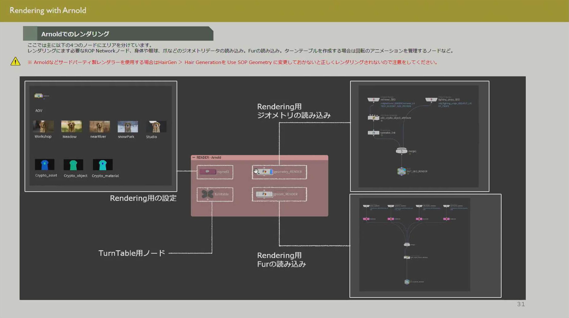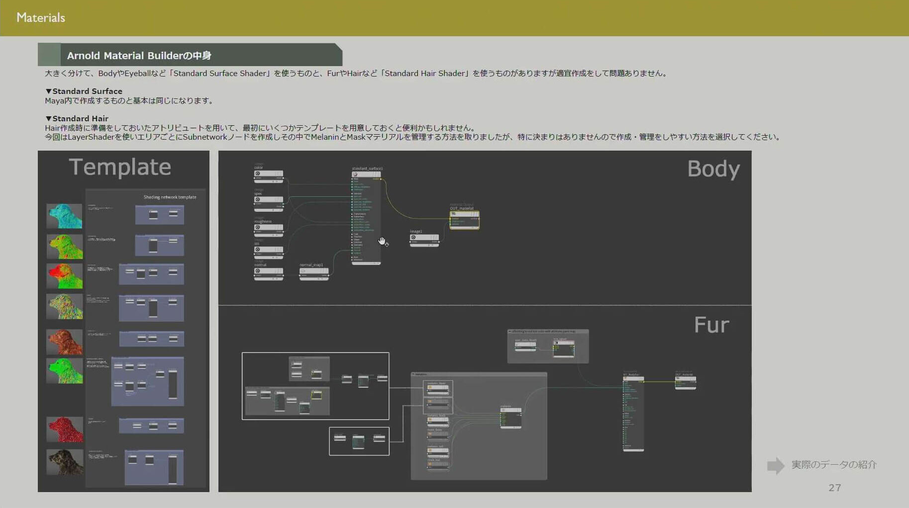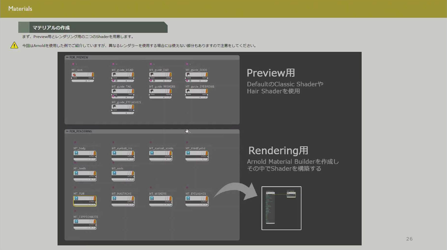 セミナー後半はマテリアル設定のノウハウ解説からスタート。ファー表現の最終的な品質は、マテリアル設定に大きく左右される。西田氏は、プレビュー用とレンダリング用の2つのシェーダを用意し、Arnoldでレンダリングしている。