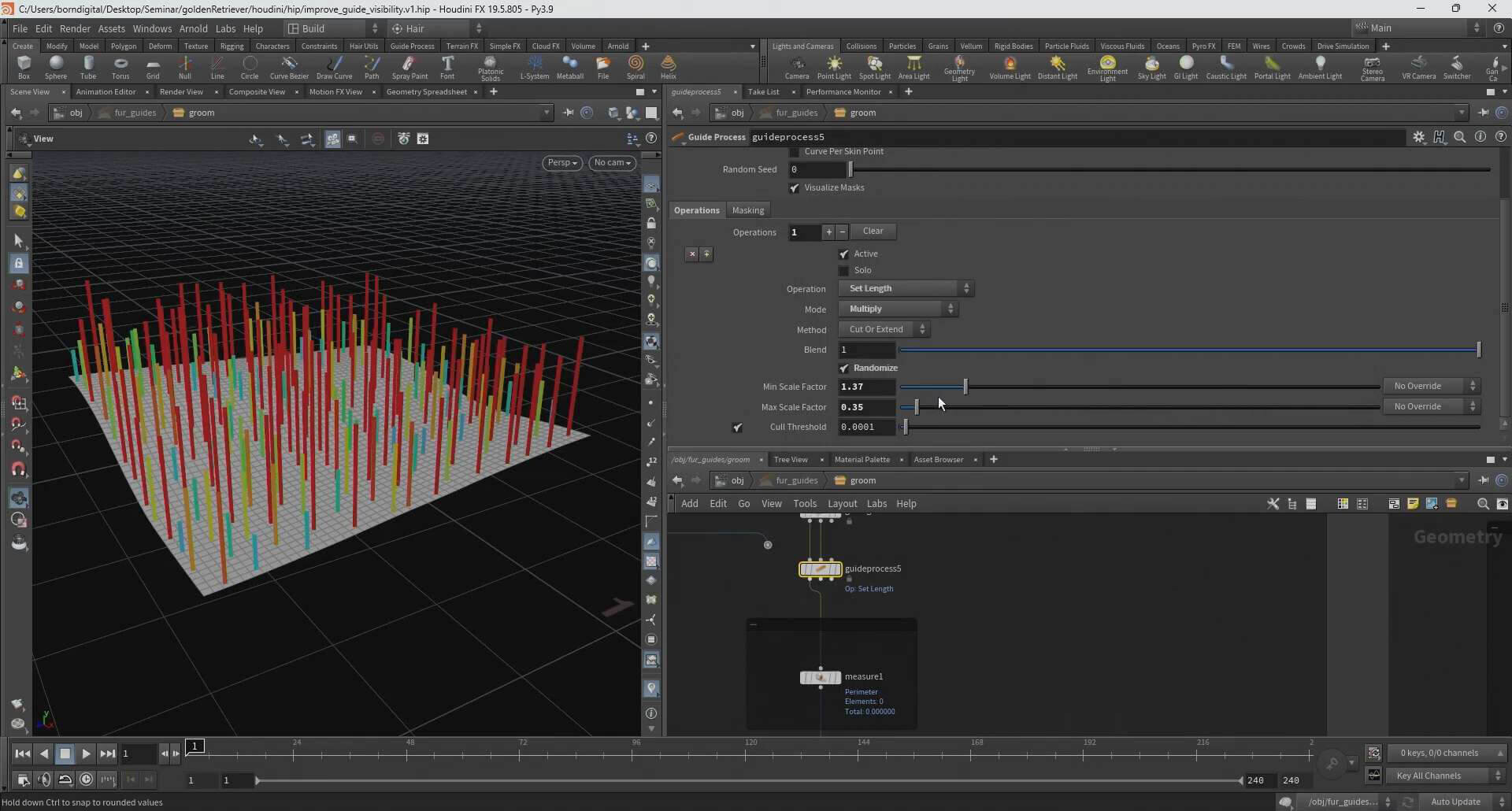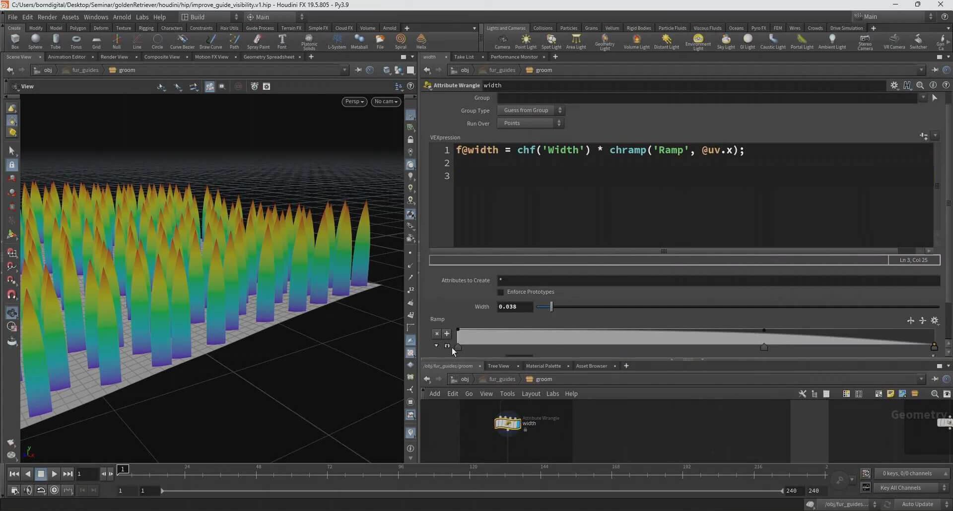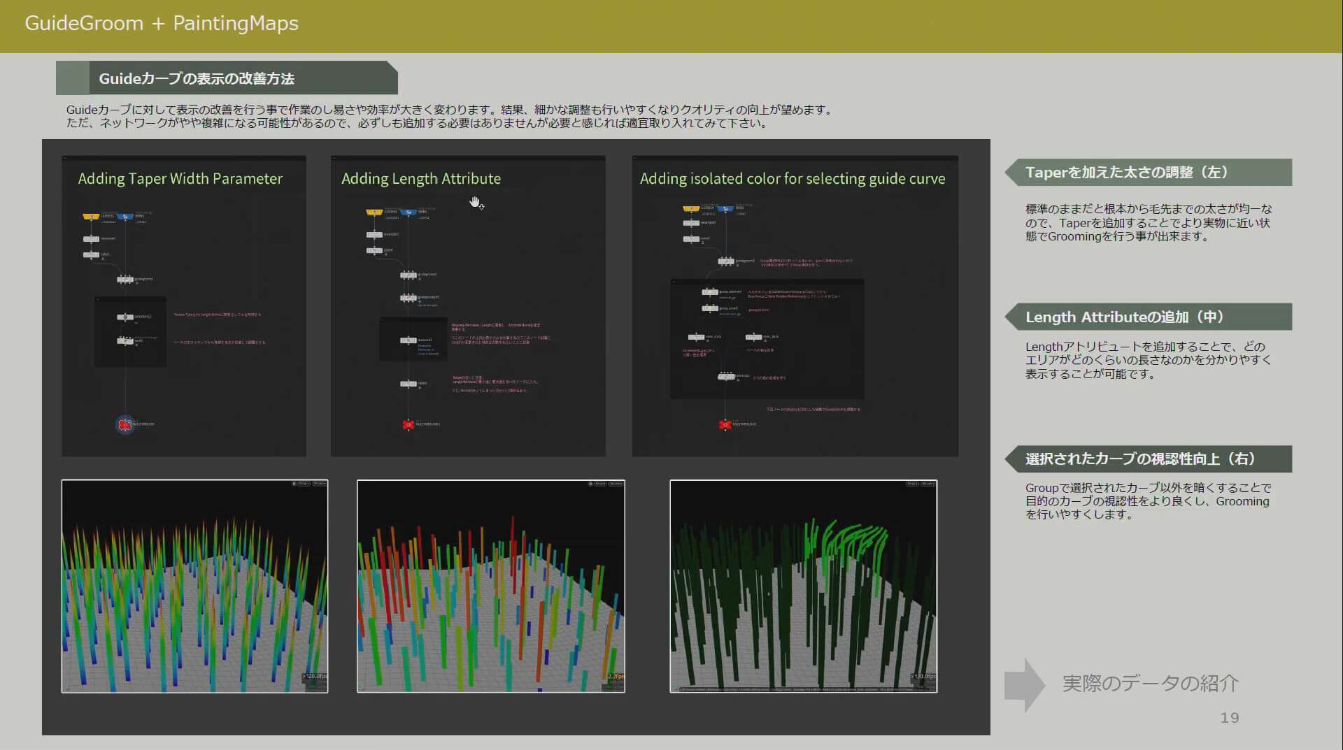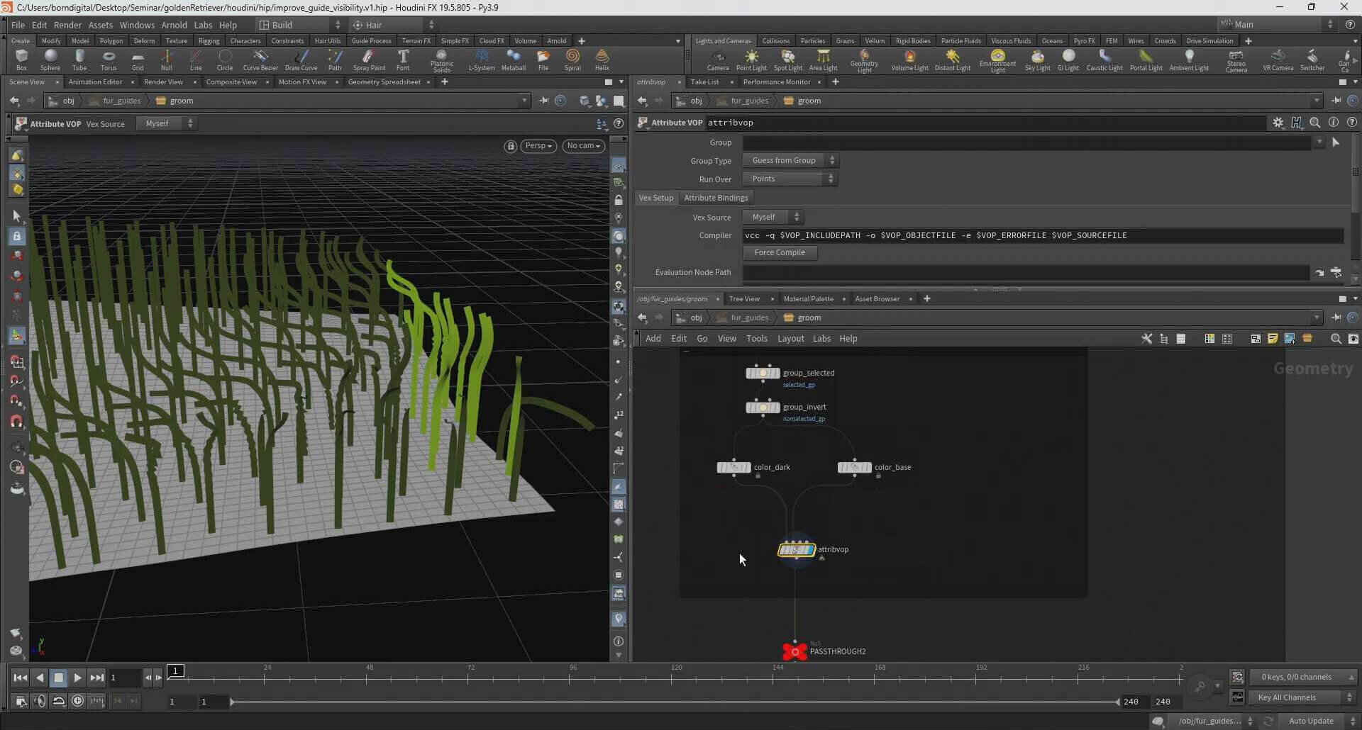 編集中のGuideカーブを他のカーブと区別できるようにハイライト表示させる。これはGroupノードとAttribute VOPノードを組み合わせて実現している。この手法は、毛が密集したエリアでの編集作業を大幅に効率化する。