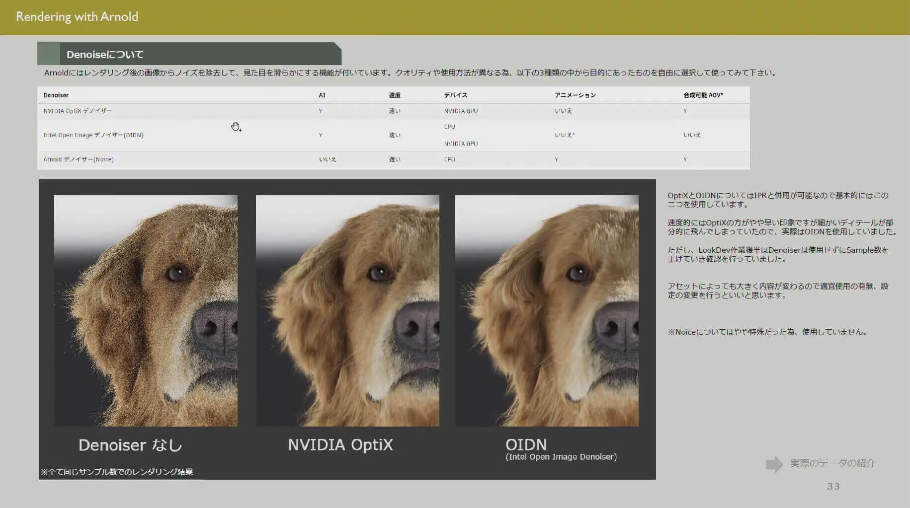 なお、Arnoldのデノイザーも試したそうだが、今回の毛の表現には合わなかったため使用しなかったとのこと。デノイザーはImagerノードから種類を選択できる。