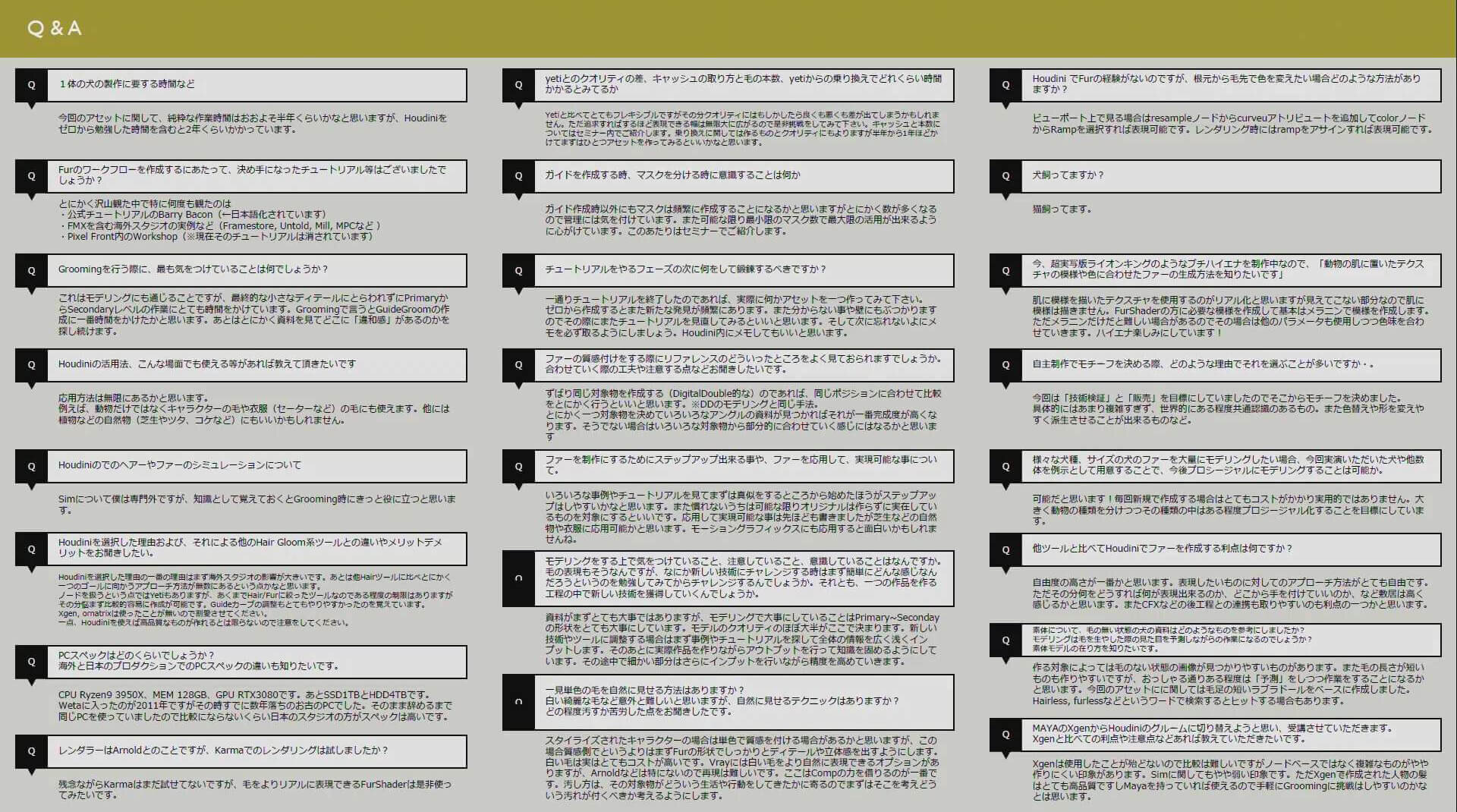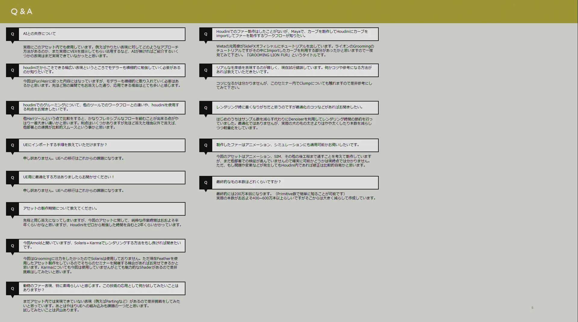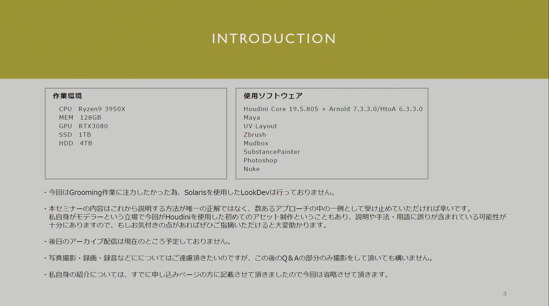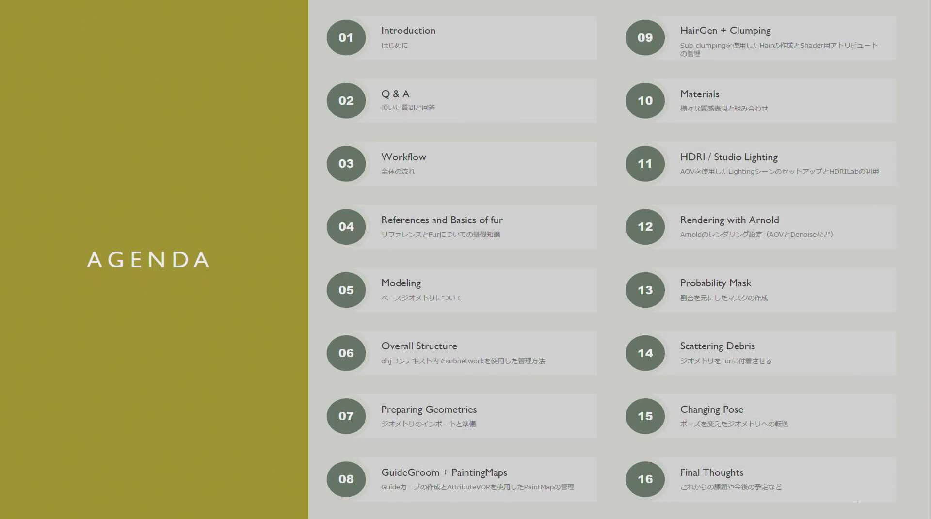 ファー制作の全貌を解説し通り終えた西田氏は、「Houdiniはプロシージャルなワークフローが得意なので、誰でも同じようなクオリティが出せるテンプレート化を狙っていきたい」と語った。そして、自身が現在取り組んでいる、鳥のフェザーツールに関するセミナーも開催したいという意欲を見せ、セミナーを締めくくった。