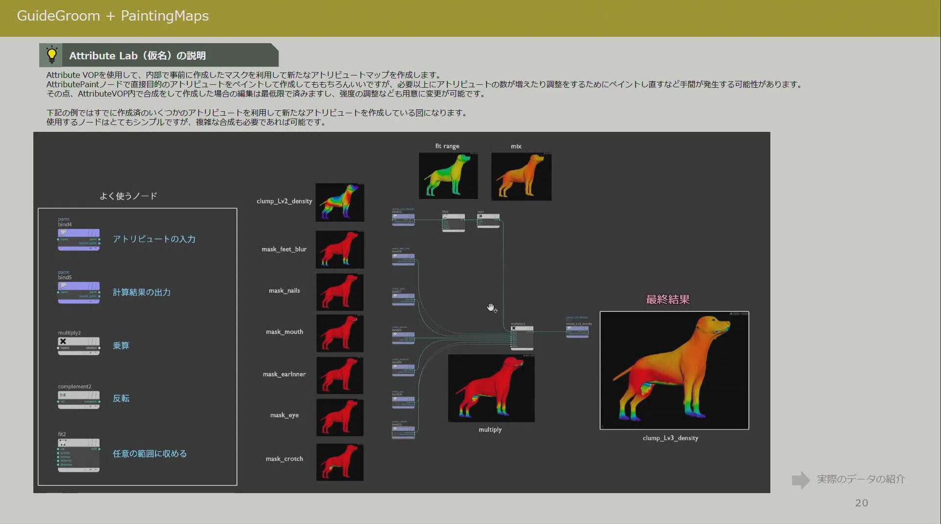 ファーの生成に必要な複数のPaintingMapsは、Houdini内でペイントして作成する。西田氏はこれを「Attribute Lab」と名付け、Attribute VOPノードを使って、最小限のマスクから最大限のマップを生成するワークフローを構築している。