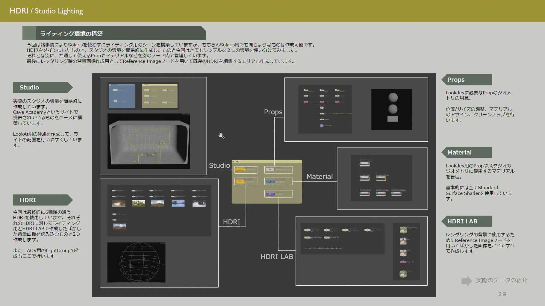 ライティングは、環境マップとスタジオライトの2種類を組み合わせて行なった。西田氏は「専門とする分野ではない」と断りつつ、効率的なワークフローについて紹介した。