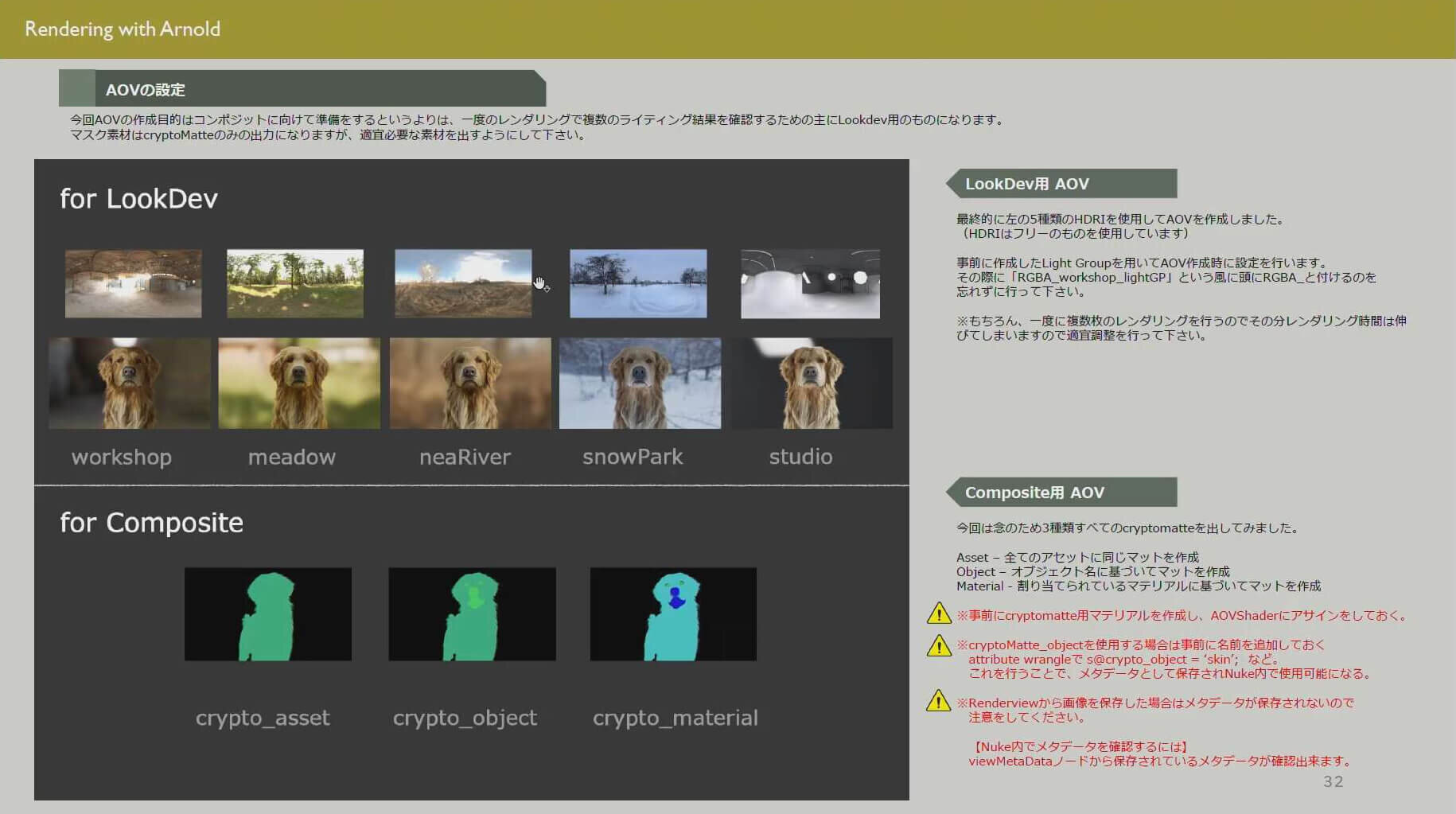 また、コンポジットでのマスク作成には、Crypto Matteを使用。Crypto MatteはAsset、Object、Materialの3種類があり、これらを適切に活用することで、Nukeなどでのコンポジット作業を効率化できる。