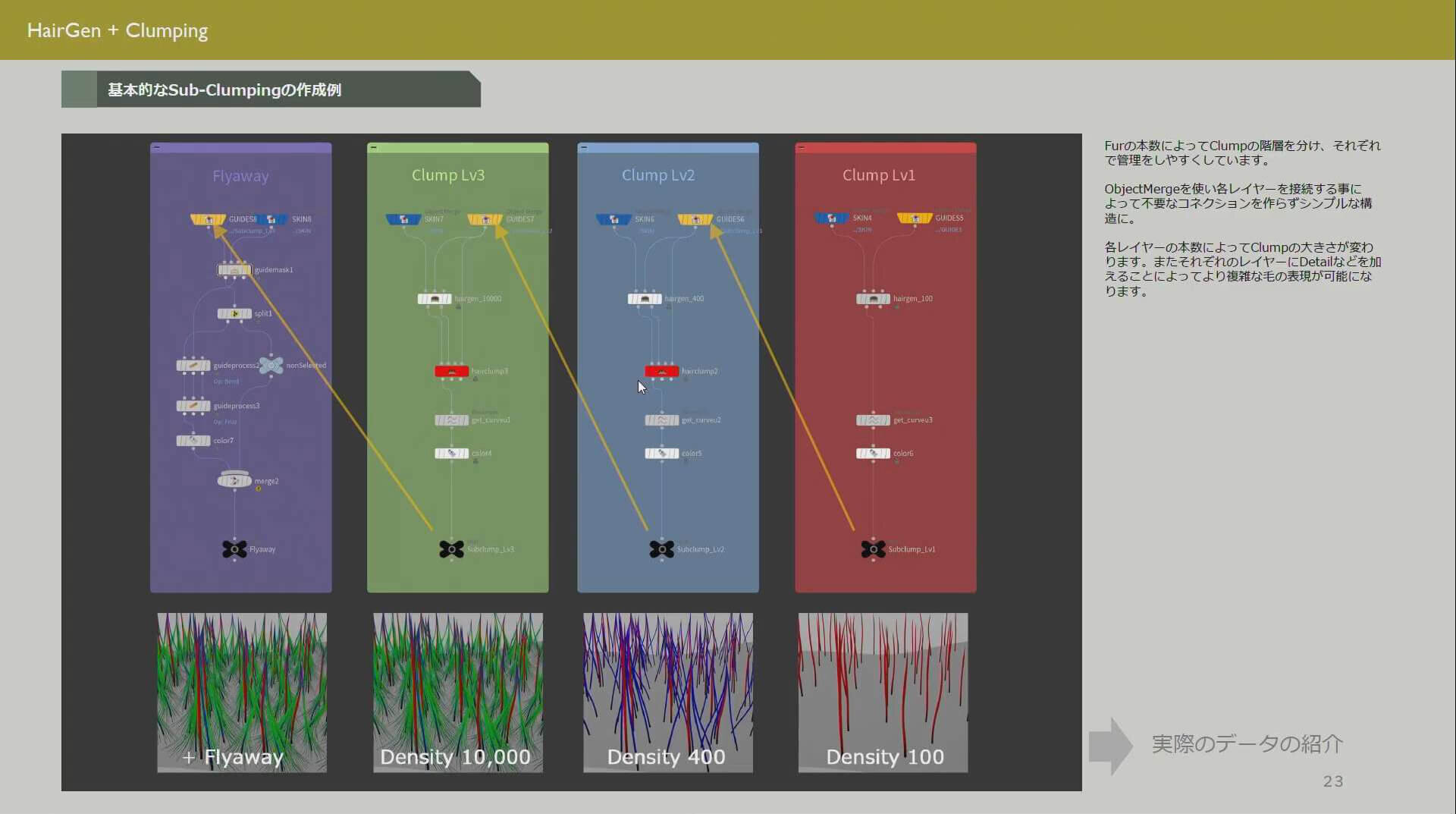 「実際の動物の毛はClumpだけでなく、その中からさらに細かい束に分かれています。レベル1、レベル2、レベル3と段階的にClumpを重ねていくこと(Sub-Clumping)で、より複雑でリアルなディテールが生まれます」。そして、この階層構造の途中でランダムなノイズやディテールを加えることで、さらに複雑なファーを表現していくという。