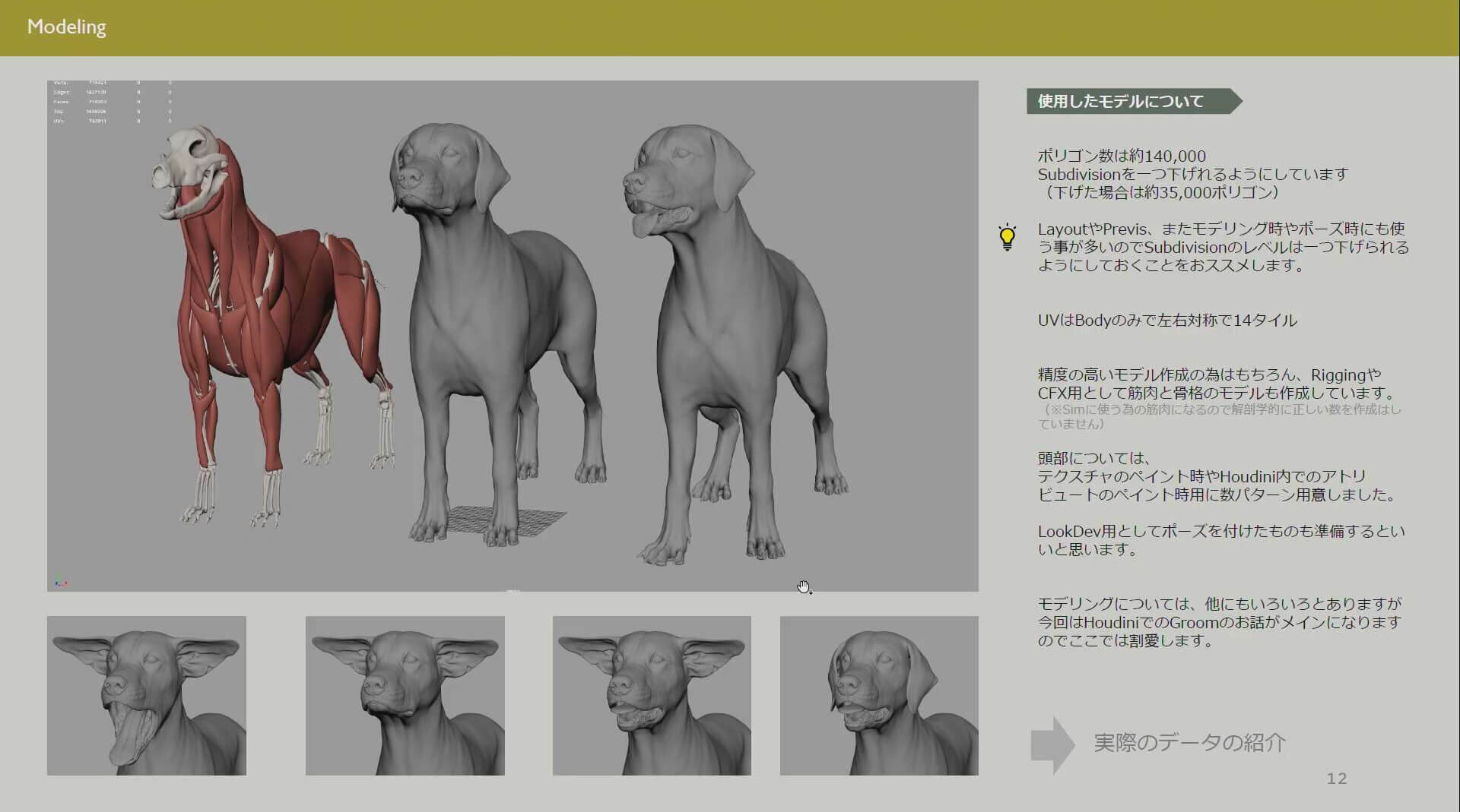 Houdiniでの作業に入る前に、モデリングとUV展開が完了したゴールデンレトリバーのジオメトリを準備する。モデルは2レベル用意され、Subdivideを1段階上げた状態で約14万ポリゴン、下げた状態で3万5千ポリゴン。この多段階のポリゴンモデルは、アセットの制作パイプライン全体で柔軟に活用される。
