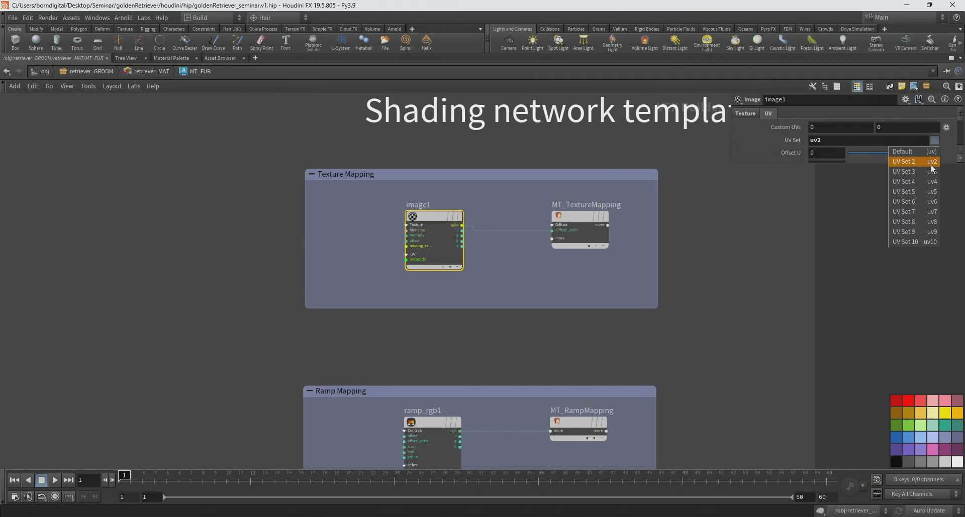 ジオメトリのUVパターンを毛に反映させるには、HoudiniのUVセットをデフォルトから2番に変更(UV Set 2、uv2)し、Imageノードでテクスチャを読み込む際のUVセットを「uv2」に指定する。
