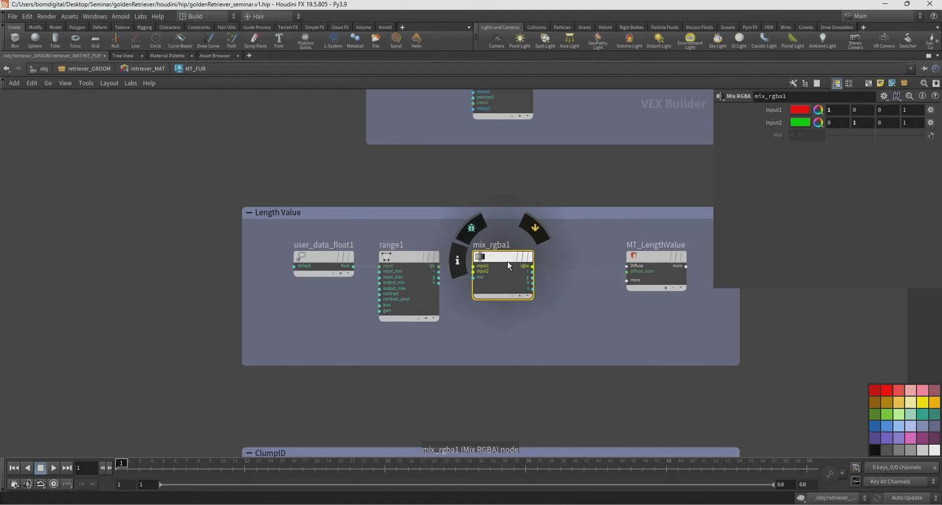 毛の長さに応じて色や質感を変化させたい場合は、User Data Floatノードでlengthアトリビュートを読み込み、Mixノードと組み合わせて使用する。また、ClumpIDアトリビュートを使用すると、ファーのClumpごとに異なる値を適用でき、メラニン値に幅をもたせるなどの調整が行える。