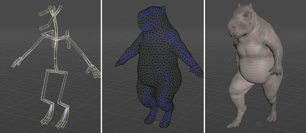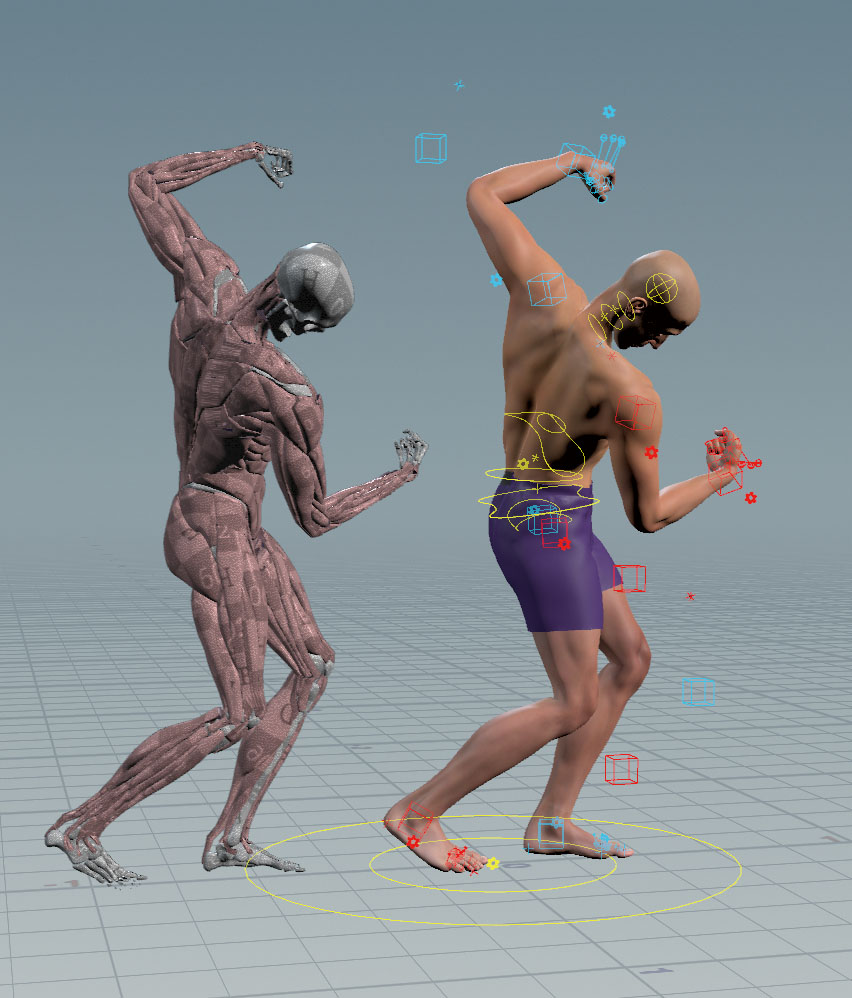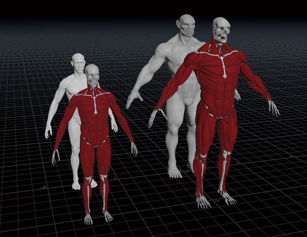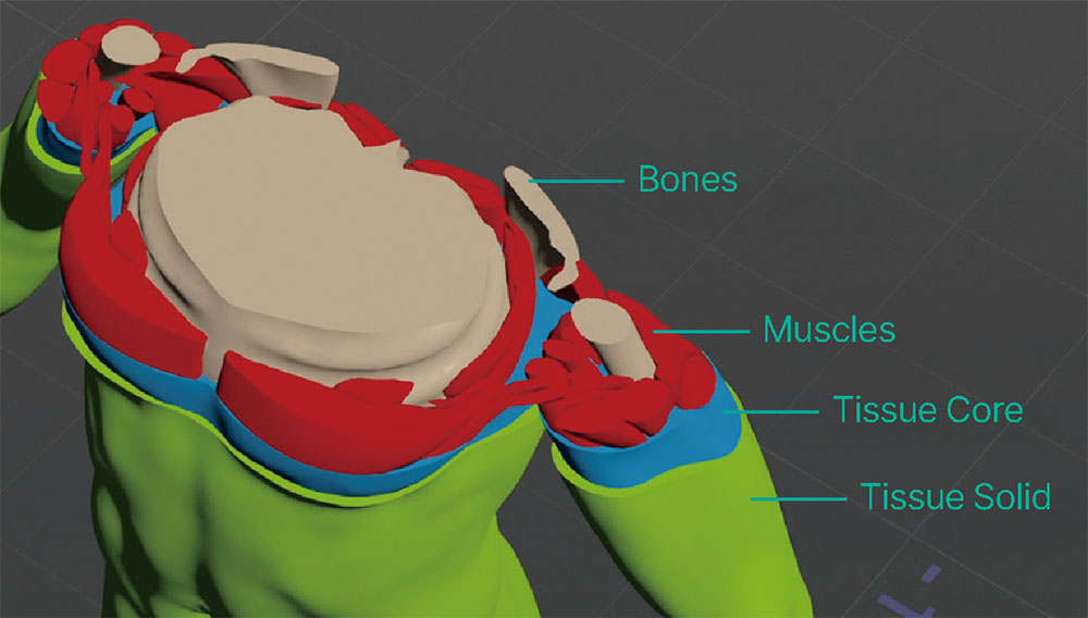 まず注目の新機能として挙げたいのが、Otis Muscle and Tissue System(以下、Otis)です。OtisはOrganic Tissue Solverの略で、最大の特徴は、これまで個別に行なっていた筋肉・脂肪などのシミュレーションを、単一のSolverで統合的に処理できる点にあります。Otisは、「骨(Bones)と筋肉(Muscles)」、「骨と筋肉を包み込むコア組織(Tissue Core Layer)」、「脂肪(Tissue Solid Layer)」の3層構造で構成されています。骨に固定された筋肉の動きが周囲の組織へと伝播することで、揺れや遅れ、変形といったリアルな動きを生み出すことができます。