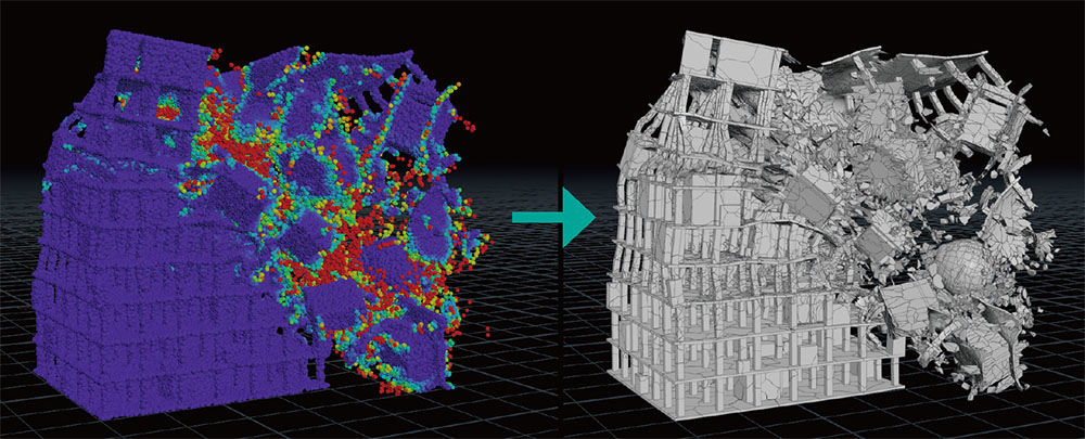 また、MPM関連ノードとして、シミュレーション結果を基にジオメトリを破片に分割するMPM Post-Fracture SOPや、それを動かすMPM Deform Pieces SOPが実装され、レンダリングまでのワークフローが整備されました。剛体以外でも、新たに追加されたMPM Surface SOPにより、シミュレーション結果のポリゴンやVDBへの変換が容易になっています。さらに、Debriの発生源を作成するMPM Debris Source SOPも追加され、MPMシミュレーションからのDebri作成がより簡単になりました。