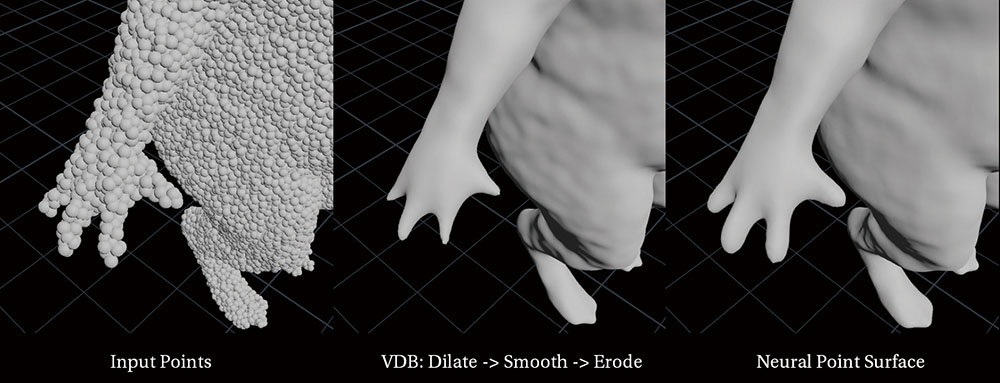 そのほか、Neural Point Surface SOPの実装も注目ポイントです。これは点群を入力することでVDBサーフェスを構築するノードで、シミュレーション結果のメッシュ化などに活用できます。実はこのノード、様々な素材モデルを学習したONNX Interfaceノードを内蔵しており、シャープなディテールを保ちながら滑らかなサーフェスを構築することが可能です。liquid、smoothなどのモードが用意されており、用途に応じたVDBを生成できます。このノードは、既存のParticle Fluid Surface SOPや前述のMPM Surface SOPにも組み込まれています。なお、CUDAを使用するGPU環境での実行を前提としており、CPUでの実行は非常に遅くなる点には注意が必要です。