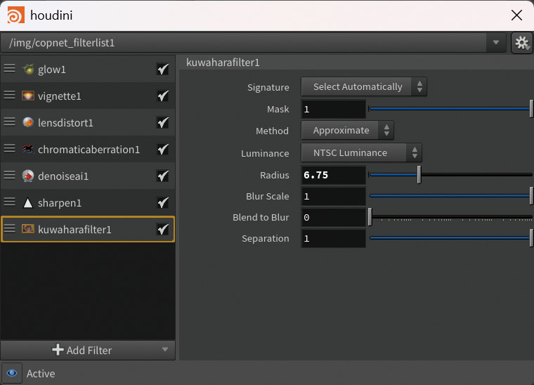 ライティング関連では、Geometry Light LOPの新設によって、ジオメトリライトの設定がより簡単になりました。Slap Comp機能も強化されており、Filter Listの実装により、GlowやDefocusなどのポストプロセス効果をリストから選択するだけで適用できるようになりました。