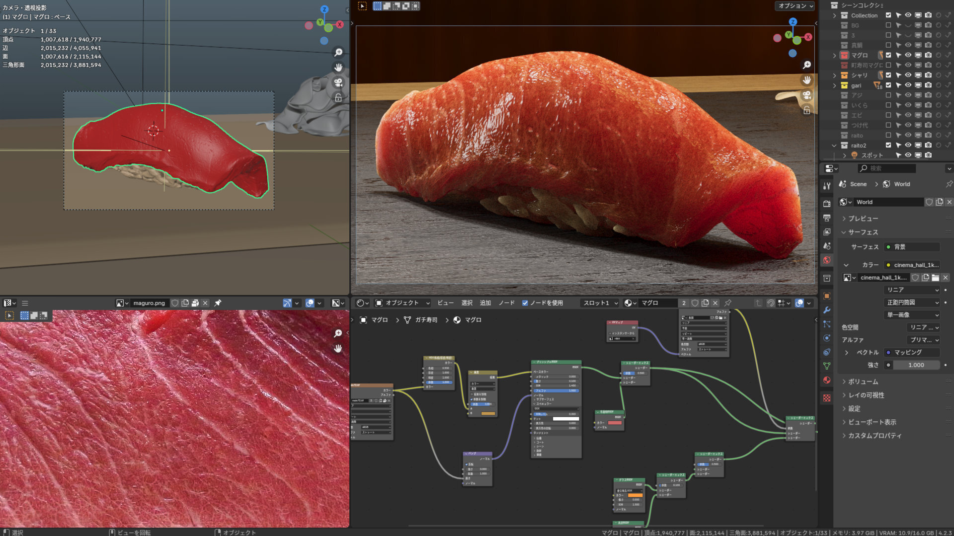 お雑煮は、餅以外の要素は実際に料理した食材をフォトグラメトリーしたものを利用しています。動かないオブジェクトはCGでイチから作るよりも実物をフォトグラメトリーしたものをベースにした方が、コスパ良く美味しそうに見せられるため、この手法を採りました。