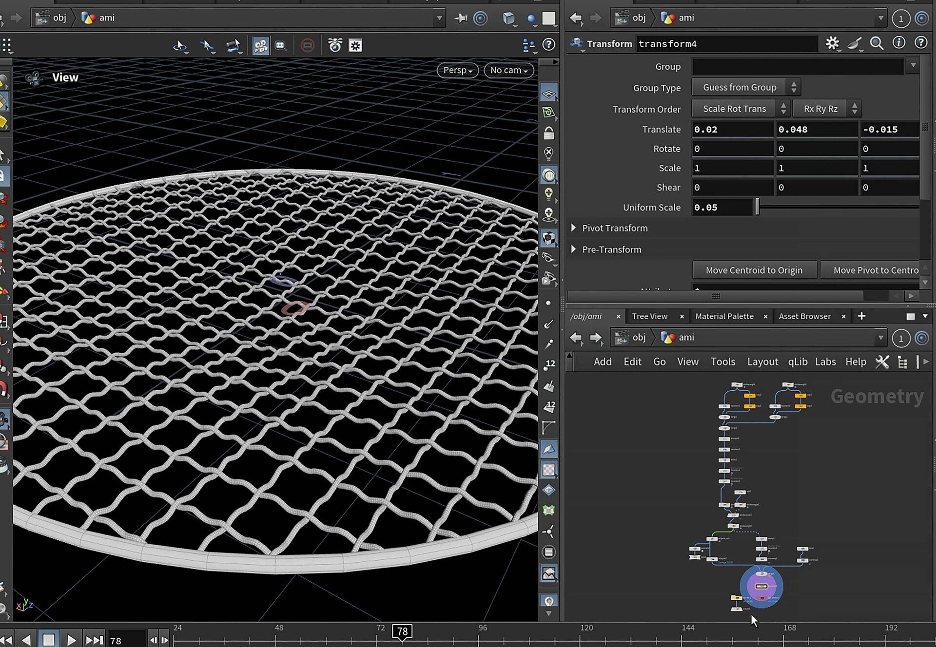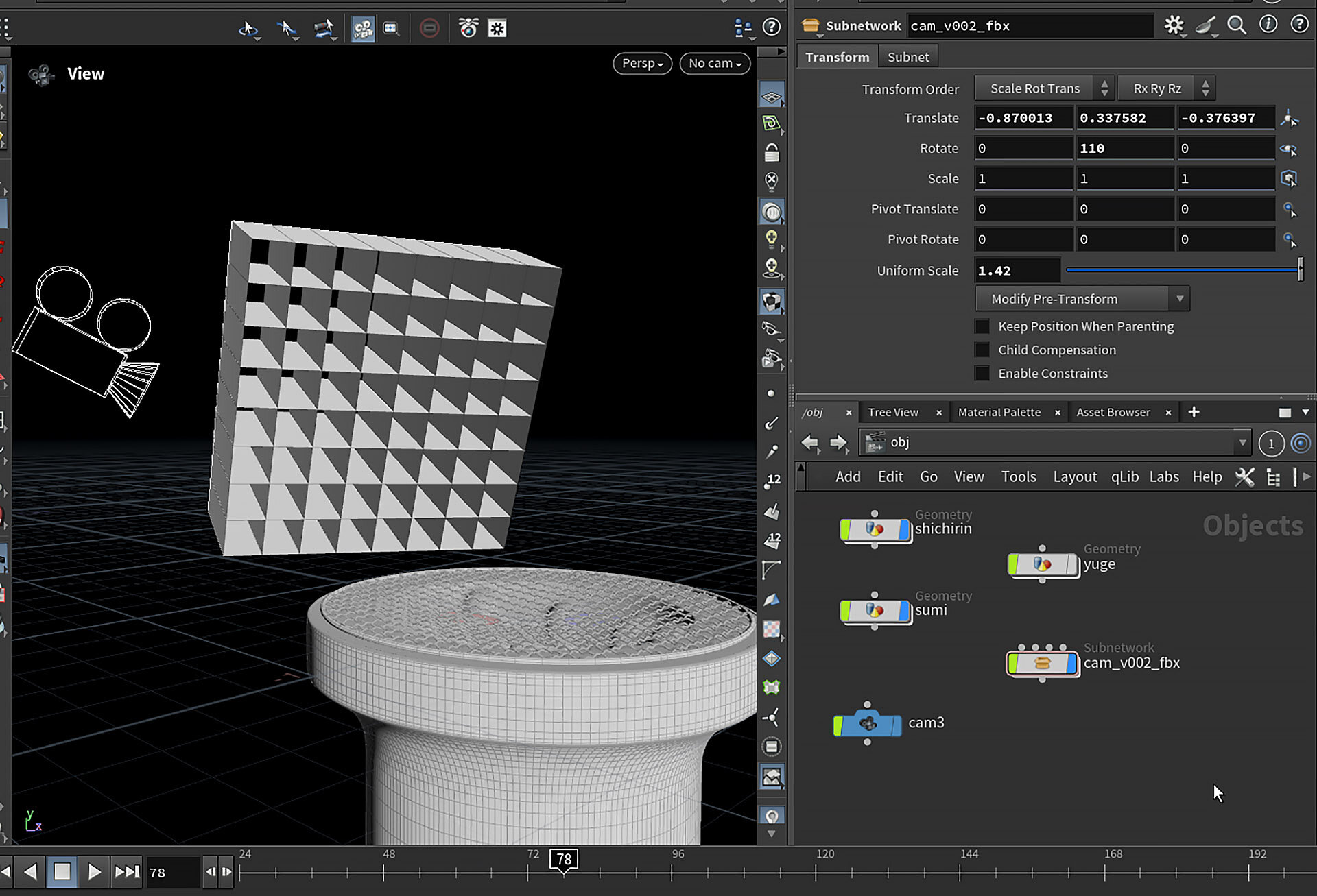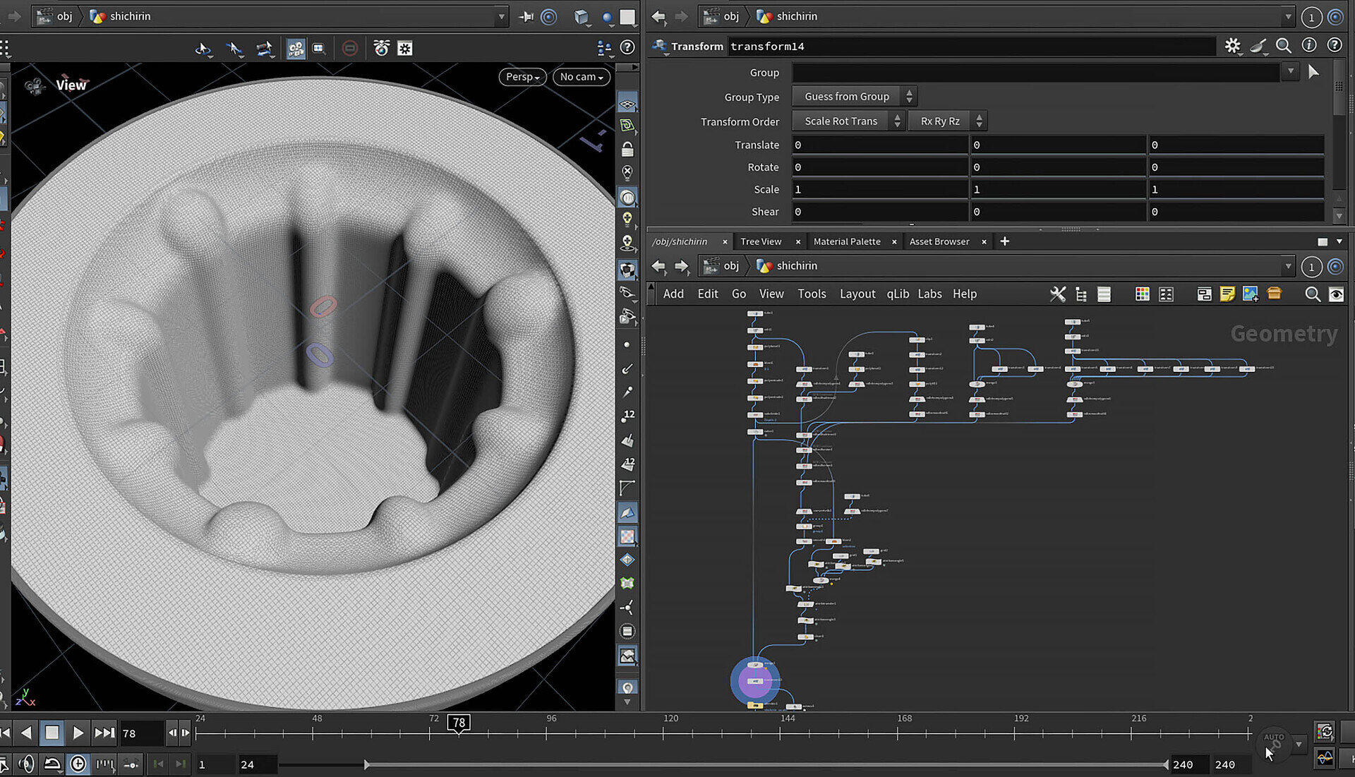 そもそもHoudiniは、シーン構築するツールとしてとても優秀だと感じています。Alembicに変換するとか、シェーダを組み直すといった手間がなく、全てノードにまとめておいて、コピペだけで追加や差し替えといった作業をスムーズに行える点は他のツールにない独自のアドバンテージだと思っています。あらゆるデータがノードひとつにまとめられるのがとても便利です。