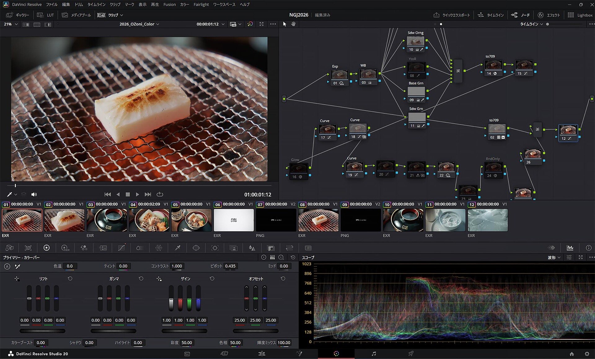 食べ物の場合、濃いギトギトなグレーディングにするとどんどん美味しさから遠のいてしまうので、ナチュラル方向だけど撮って出しではないラインを探りました。こうしたルックでもカラーグレーディングは必須の工程です。