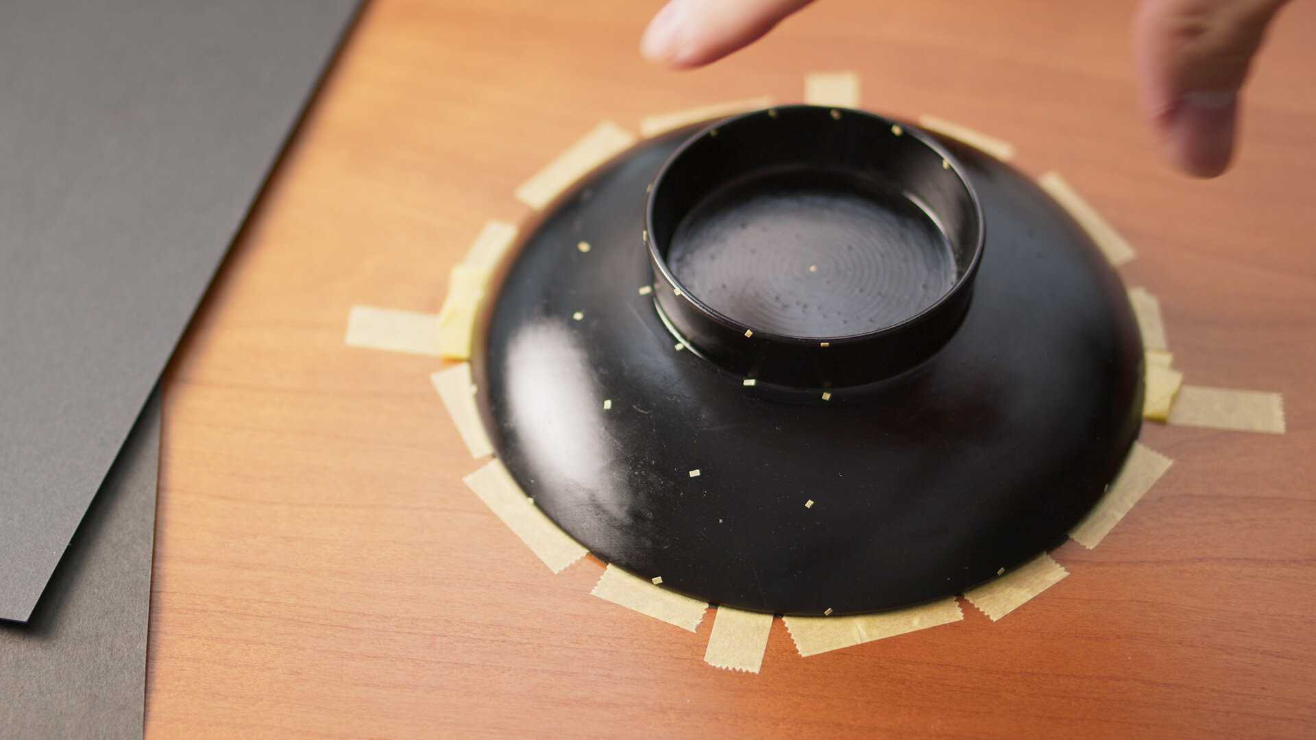 撮影では、お椀と同じ直径の紙をバミリとして机に貼った上でお椀を配置。それを基準にカメラとライトを決めていきました。