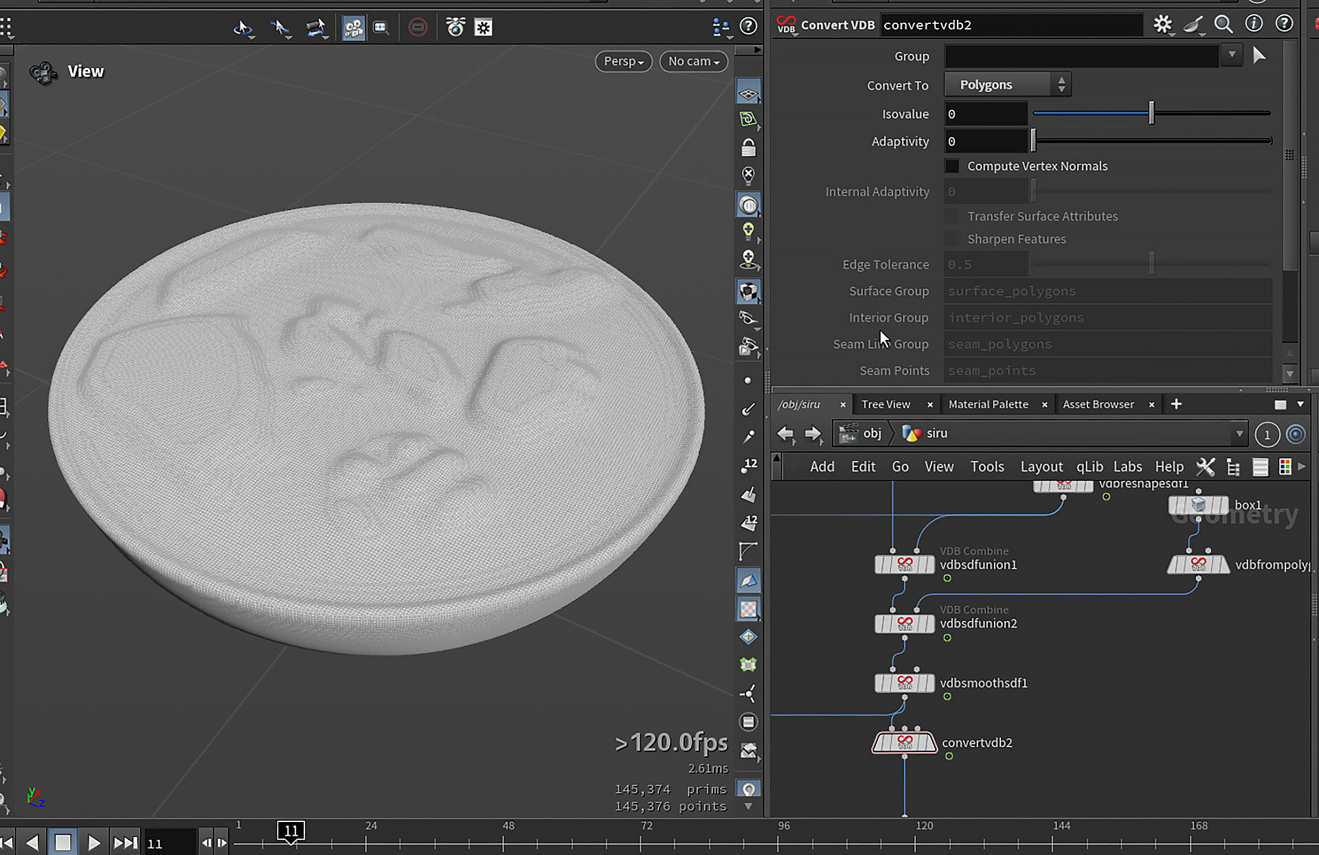 お雑煮の液面はまず、表面張力の表現に「Volume SDF」を使いました。SDFは表面が0になるボリュームデータです。つゆ(液)と具材をSDFにして、1つにマージしてぼかすことで、表面張力風の形状にしています。簡易的な方法ですが、これだけで十分なクオリティになりました。