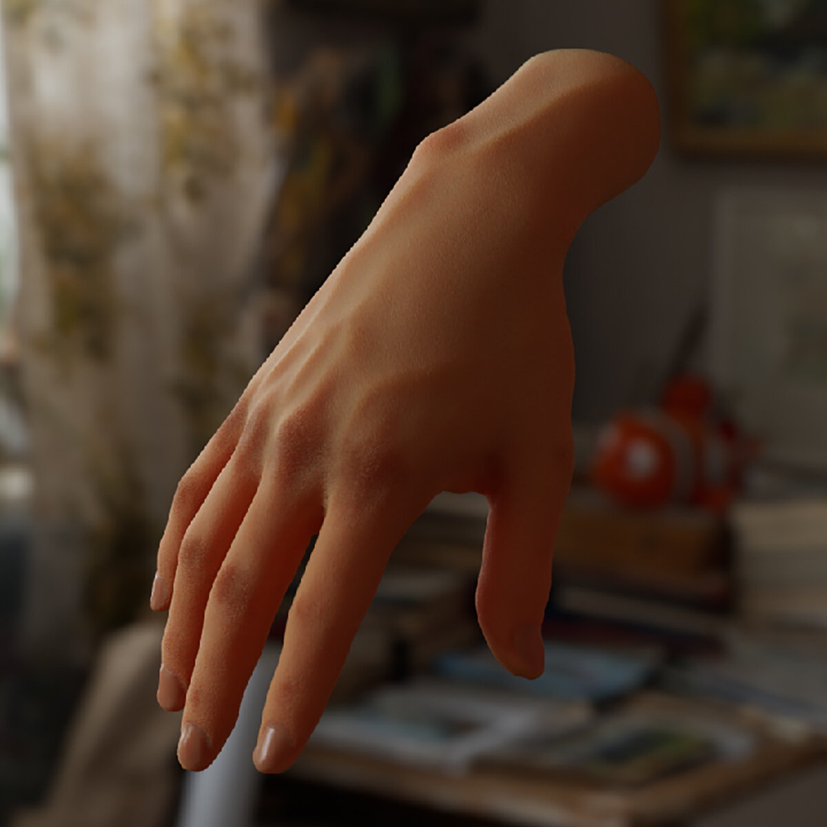 そこで実写撮影時にフォトグラメトリーで手をスキャンしたものを、BlenderのRetopoflowを使って軽くリトポ。それにリグを入れてSubstance 3D Painterで簡易的なスキンテクスチャを描きました。