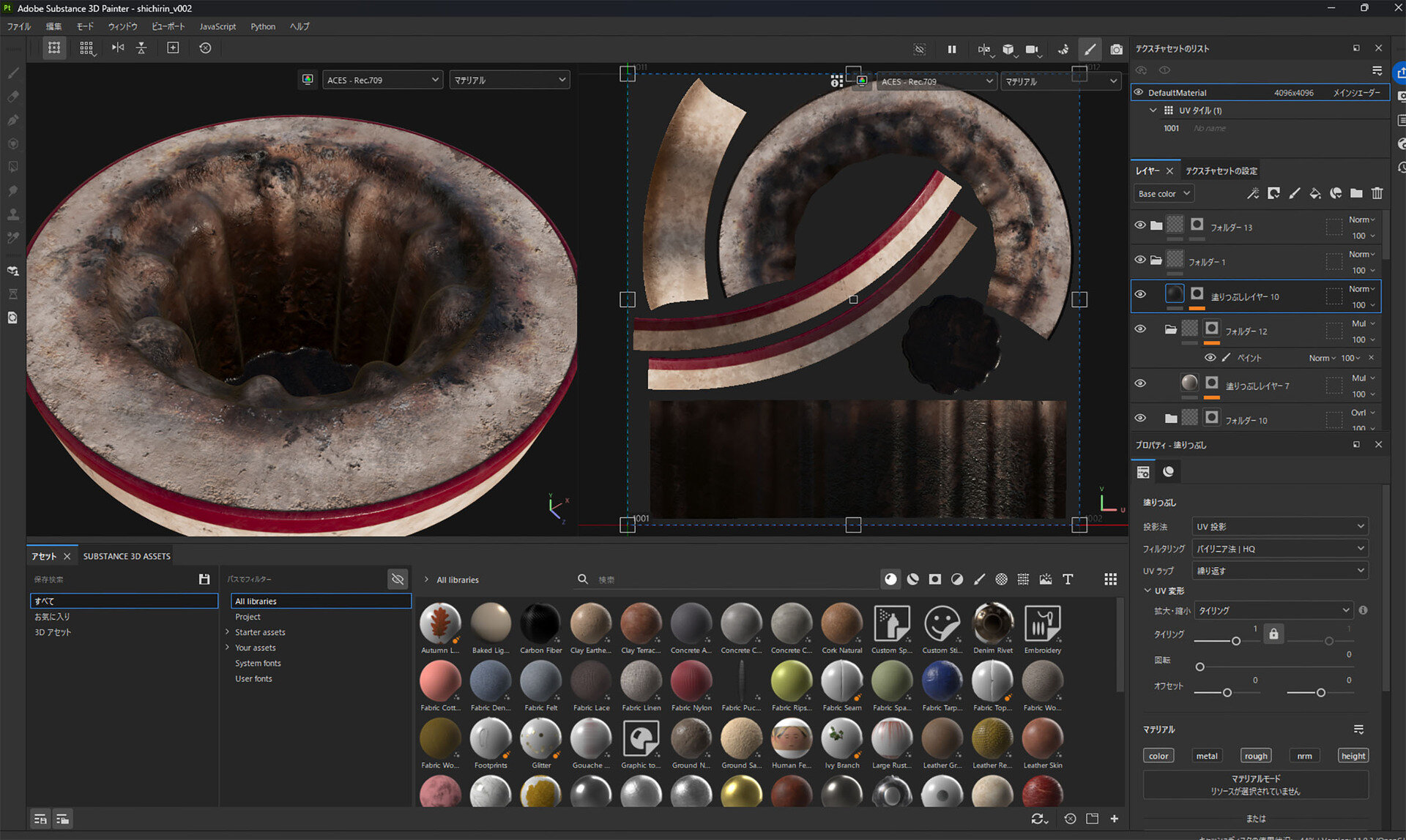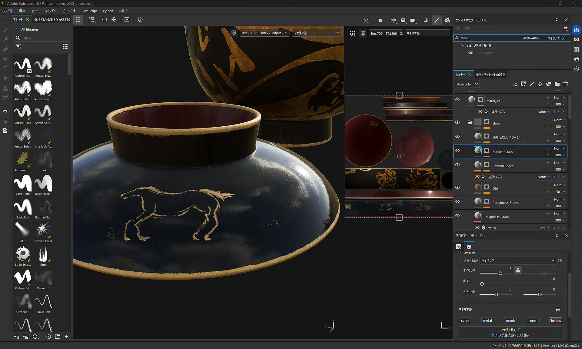 マテリアルはSubstance 3D Painterで作成しています。モデルをHoudiniで作ることによって、後からの修正がやりすかったのが良かったです。マテリアルについては、とにかくリファレンスを見ながら丁寧に描き込みました。