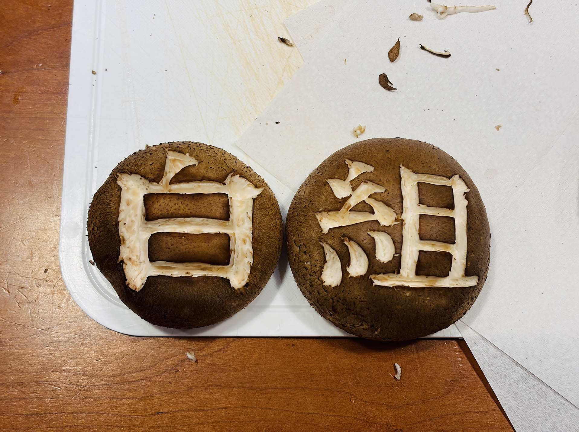 彫り文字を担当したスタッフが実物に彫ってくれましたが、ちゃんと茹でるとどうしても縮んで文字が崩れてしまいました。そこで軽い茹でに止めた状態の椎茸をフォトグラメトリーしたものを利用しています。
