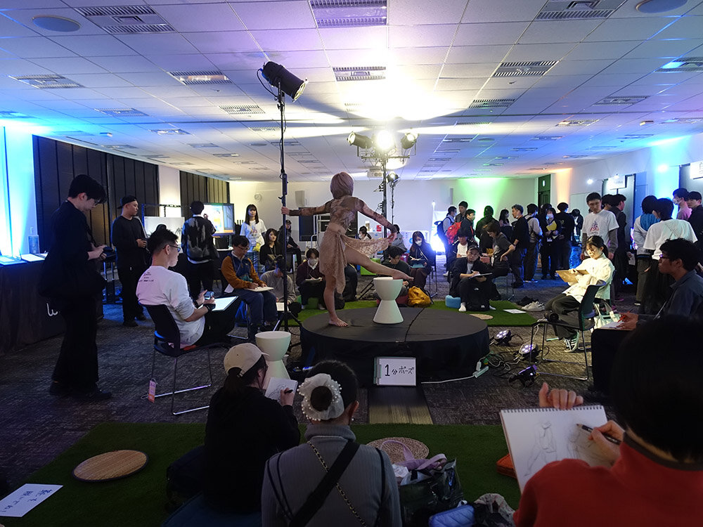 コンテンポラリーダンサーのMIDORI氏がモデルを務め、ポーズを取る1分間のうちに参加者がデッサンを仕上げるトレーニング。ジェスチャードローイングとも呼ばれるこの手法は、デッサン力を鍛える効果があるとされ各所で採り入れられている。フィギュアではなく目の前でモデルがポージングしてくれる貴重な機会で、参加者は真剣な眼差しでクロッキー帳に鉛筆を走らせていた。また、ゲストとしてストーリーボードアーティストの栗田 唯氏も参加した。
