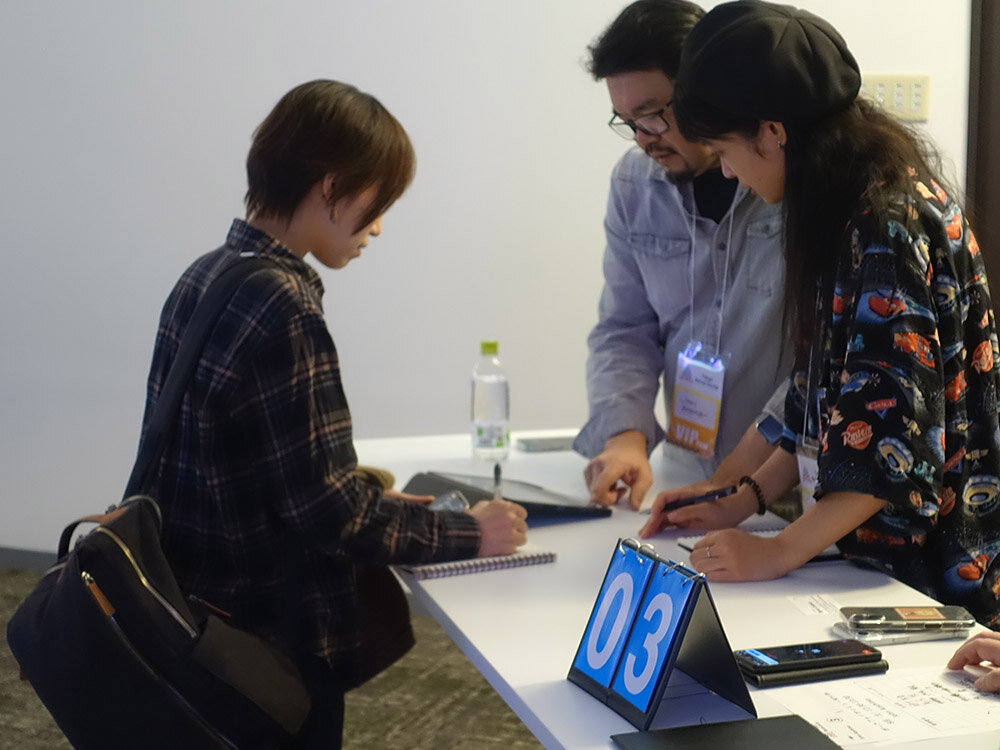 シアタールームで講演した第一線で活躍するアーティストに自身のポートフォリオを見せ、直接レビューやフィードバックを受けられる。ジョン・アオシマ氏には通訳が付き、学生にアドバイスを与えていた。