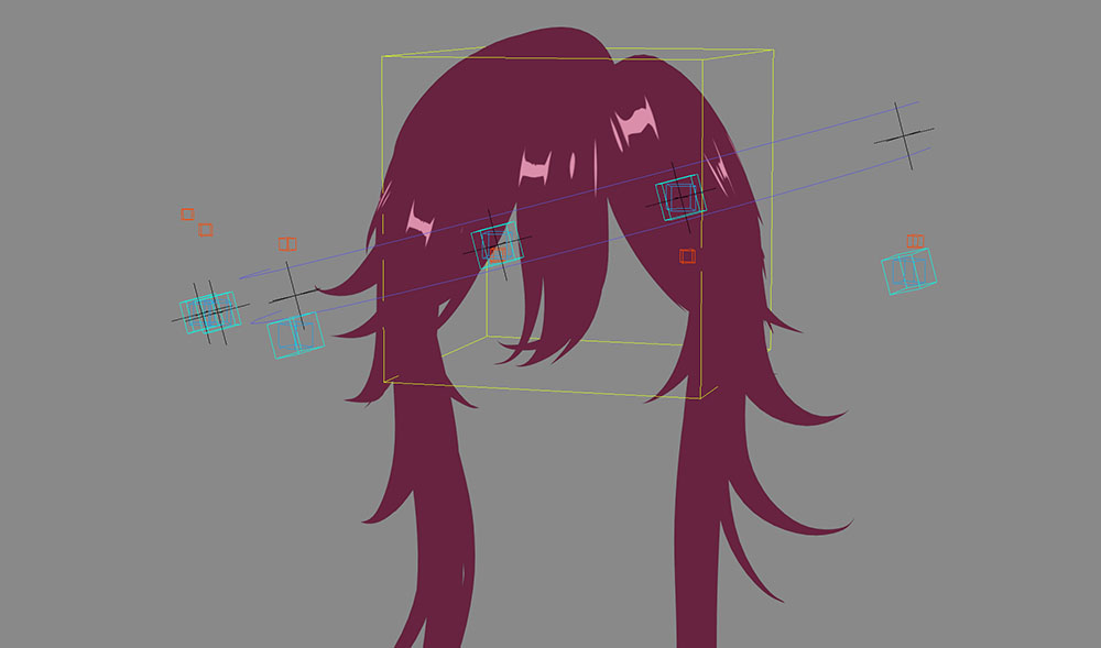 長髪の望見は、前髪・後頭部・ポニーテールの3つに分けてリグを設定しており、ここでは前髪リグのみ表示している。他3人はリグを分けておらず、望見の前髪リグを後頭部まで一周させたかたちになっている。