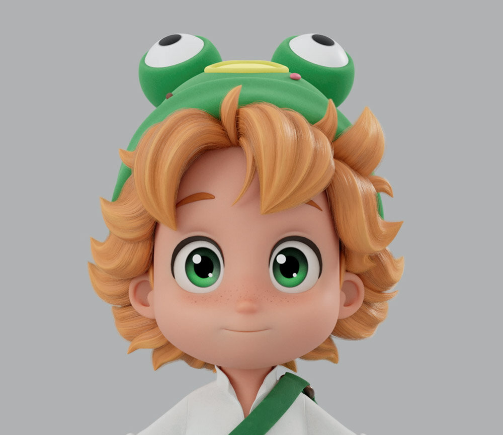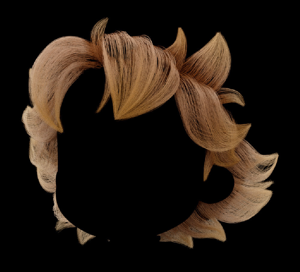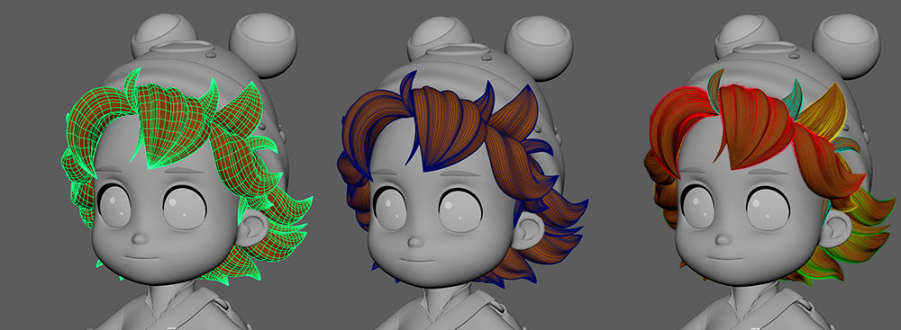 髪の毛についても、キャラクター同士のルックの調和を優先し、ポリゴンヘアとYetiを併用して制作された。眉毛はリアルになりすぎるのを避けるため、Yetiは使わず、モデルの凹凸として表現している。