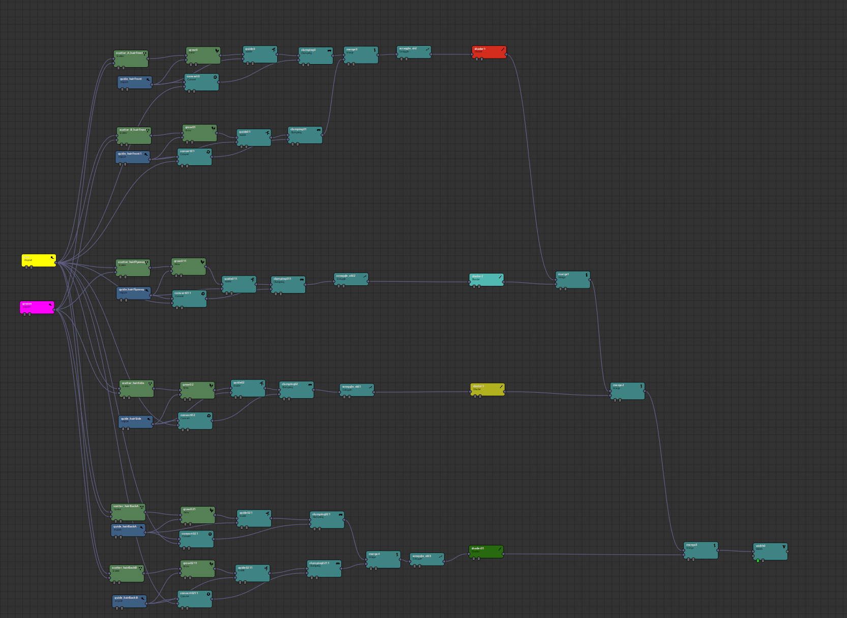 髪は干渉を避けるため、4パーツに分けて管理している。生やす範囲はYetiのAttribute Paintで制御。
