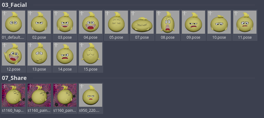 リグパートでも触れたように各キャラクターの表情集はあらかじめ準備されていたが、制作初期にはたべっ子どうぶつたちの多彩な表情を十分にカバーしきれておらず、作業が終わったショットの中でよりキャラクターらしさを表現していた表情を他のショットにも展開する、といった進め方が取られていた。
